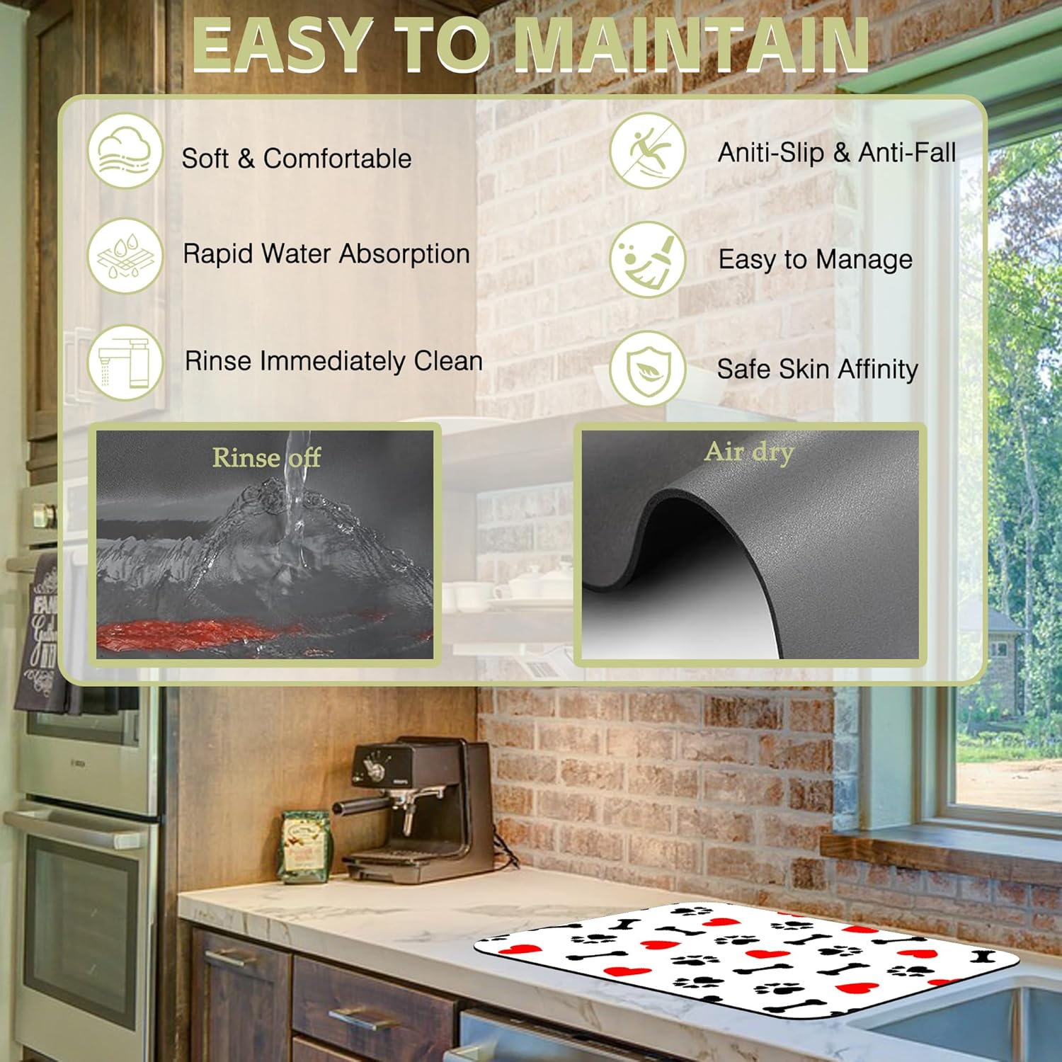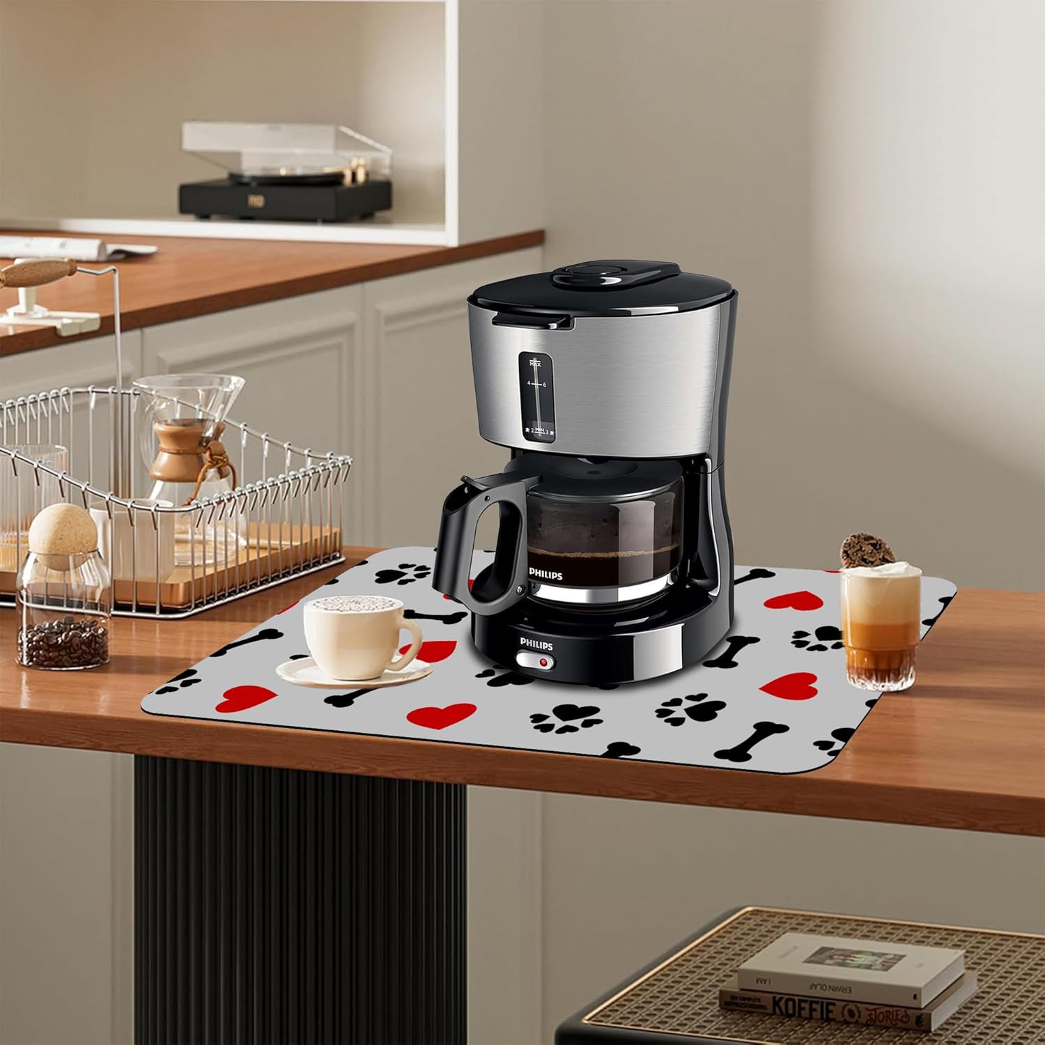 Dish Drying Mat Cute Dog Bone Paw Print Red Heart Kitchen Mat 12"x19" Bsorbent Coffee Maker Mat for Dishes,Utensils Coffee Maker Pots and Pans Easy Clean Dish Slip Resistant Pad