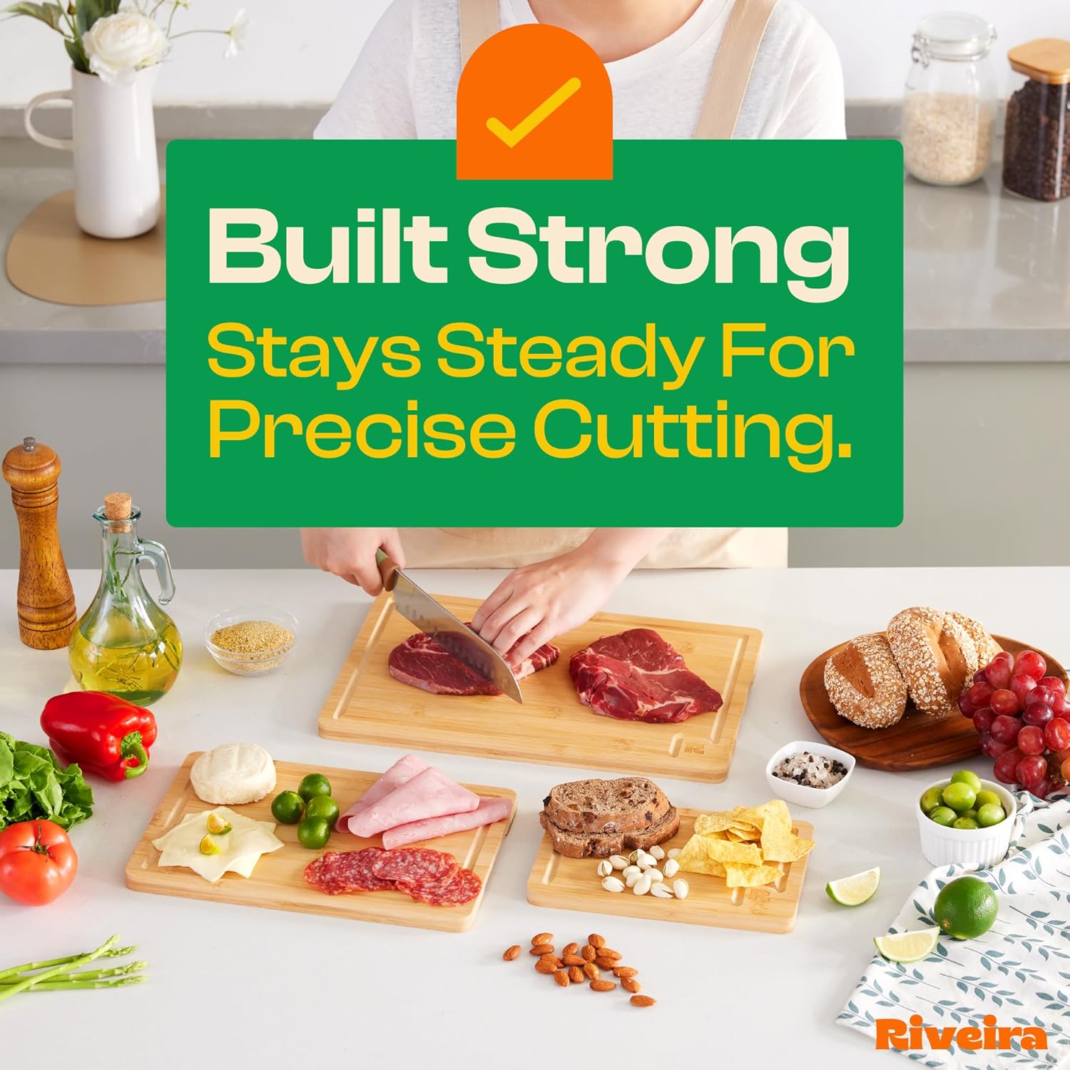 Riveira Brown Bamboo Wood Cutting Board – Gourmet Bamboo Grandeur: 8 x 8 Wooden Cutting Board – Wooden Cutting Boards For Kitchen Decorative – Innovative Juice Grooves Wooden Chopping Board