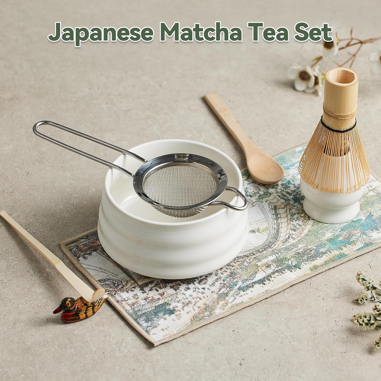 Japanese matcha set, matcha whisk and bowl, matcha sieve, matcha whisk holder, and matcha spoon - 8pcs Matcha Set (white)