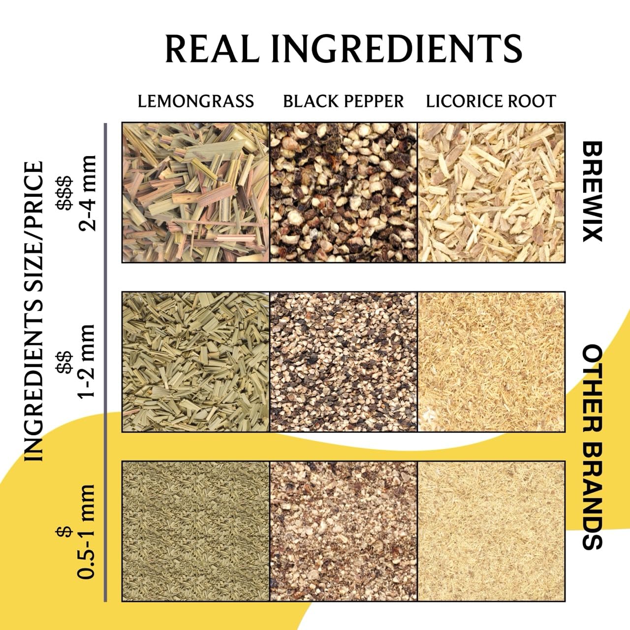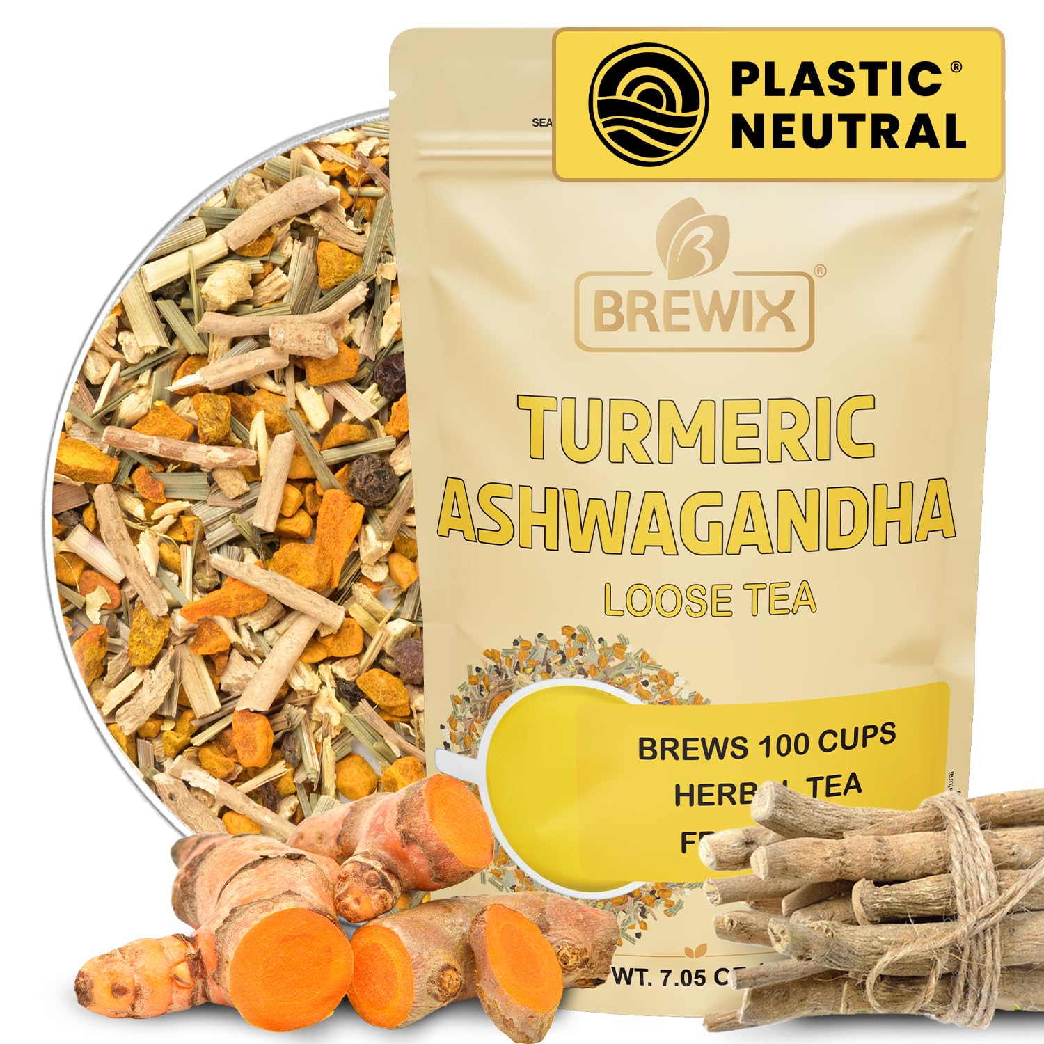 BREWIX, Turmeric Ashwagandha Herbal Tea Loose Leaf (100+ Cups, 7.05oz/200g) Real Ingredients From India, Caffeine Free & Naturally Gluten Free