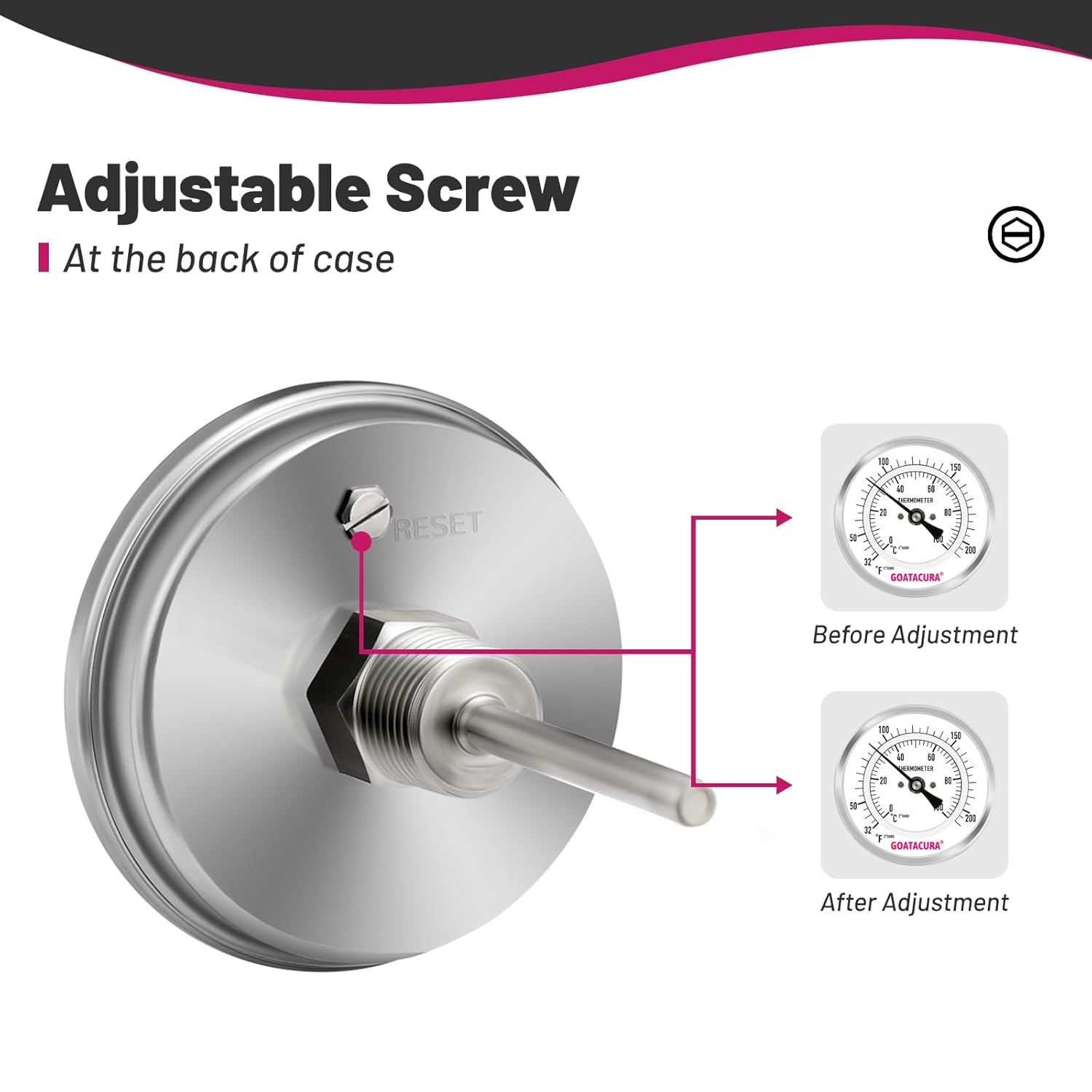 Dial Thermometer for Brewing, 304 Stainless Steel Case and Probe, 3" Dial Size, 2" Stem Length, 32-212 Deg F/0-100 Deg C, 1/2" NPT Back Mount
