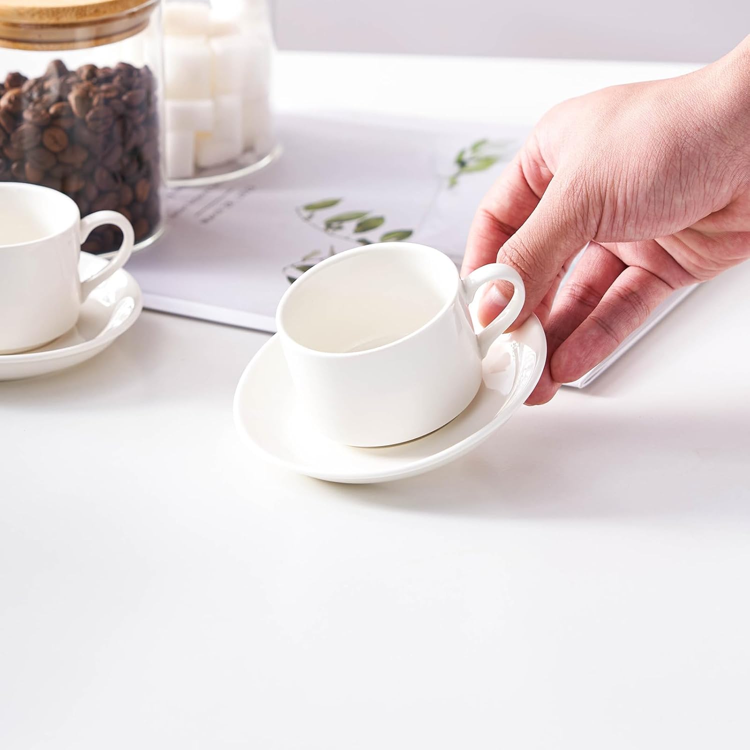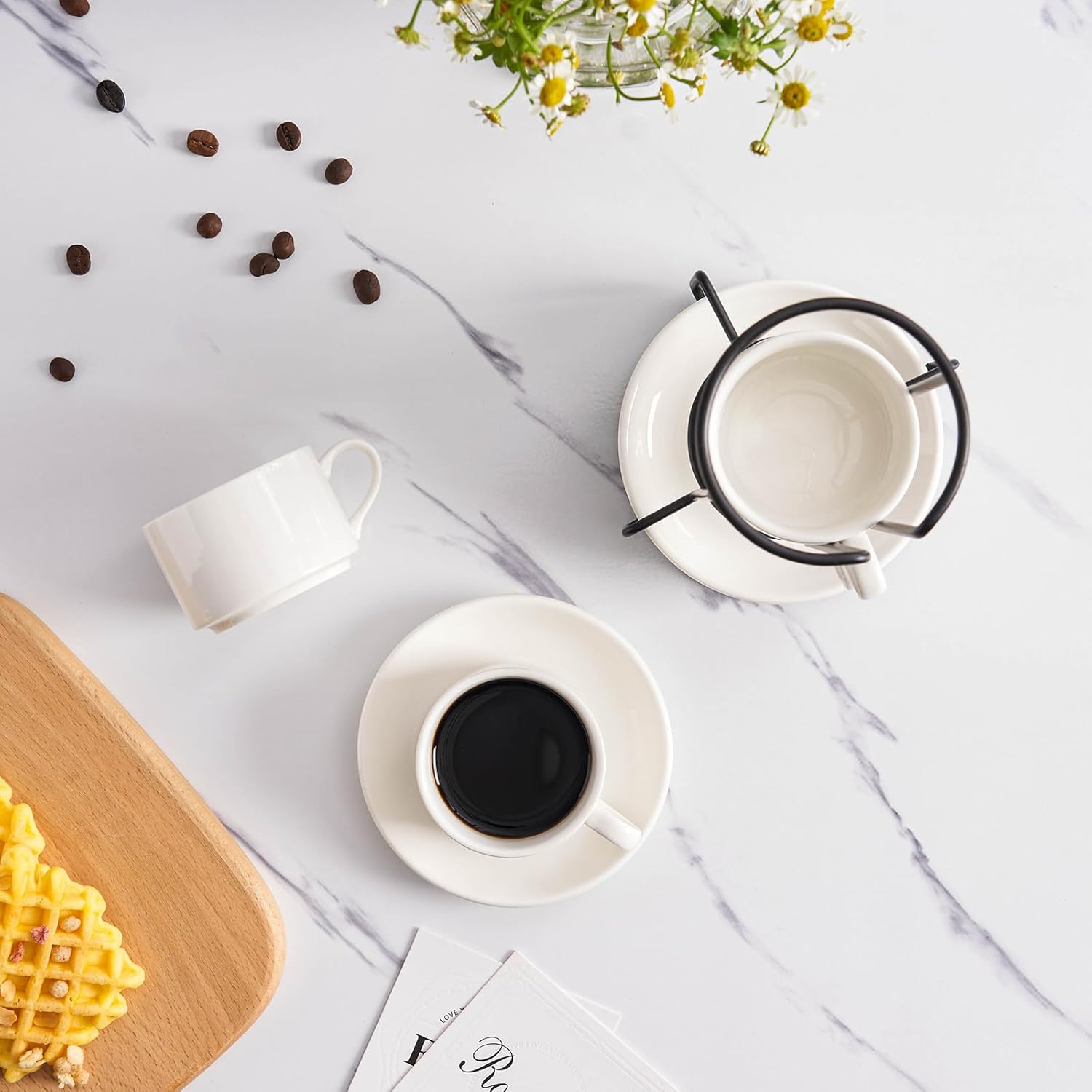 - 1. Elevate your kitchen experience with the MEICHU Espresso Cups Set. This set includes 4pcs 4 Ounce Espresso Cups with Saucers and Metal Stand, all in a classic ceramic white color. Perfect for people who enjoy coffee and conversation!