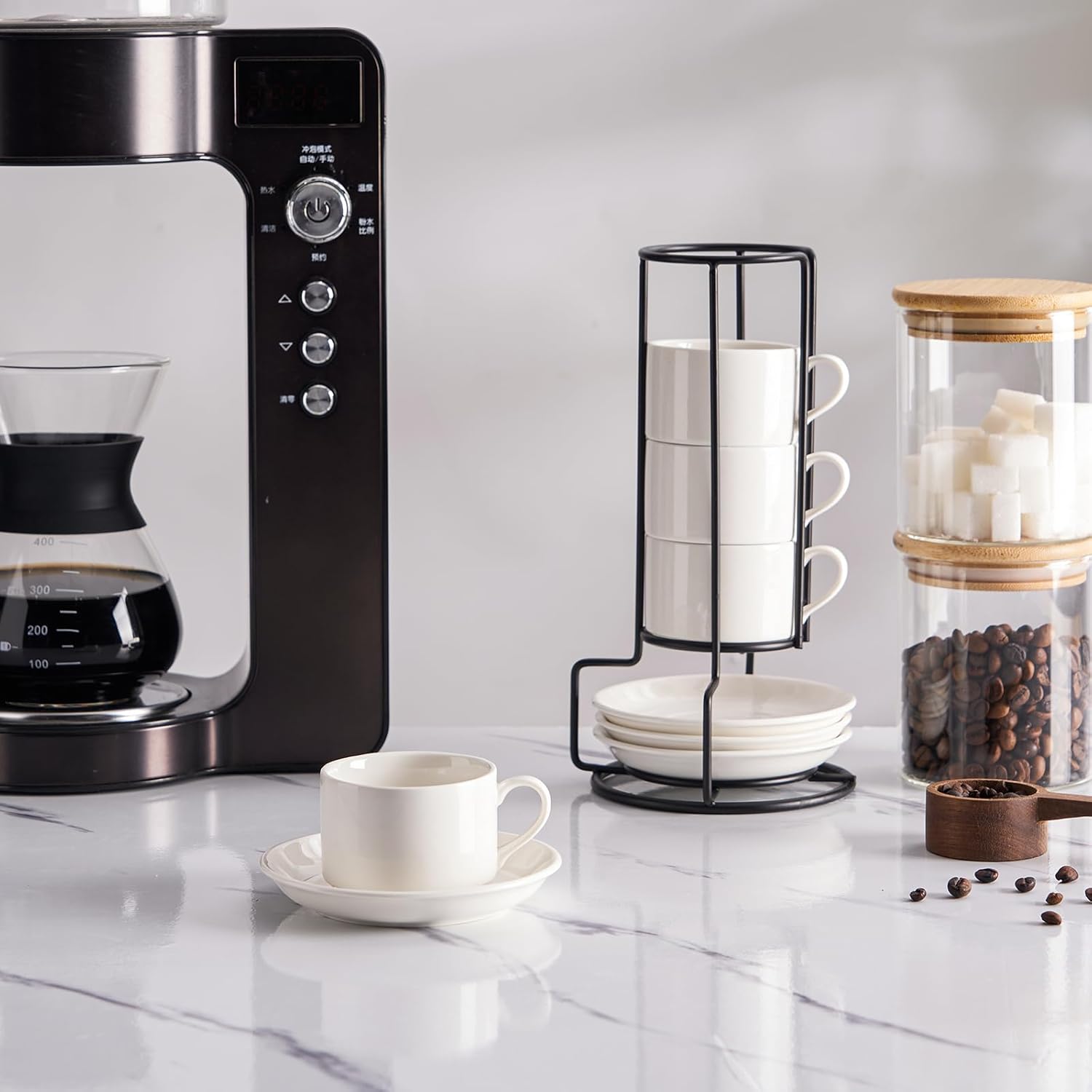 8oz Porcelain Stackable Cappuccino Cups with Saucers and Metal Stand Set of 4, Coffee Cups for Espresso, Specialty Coffee Drinks, Latte, Americano and Tea - White