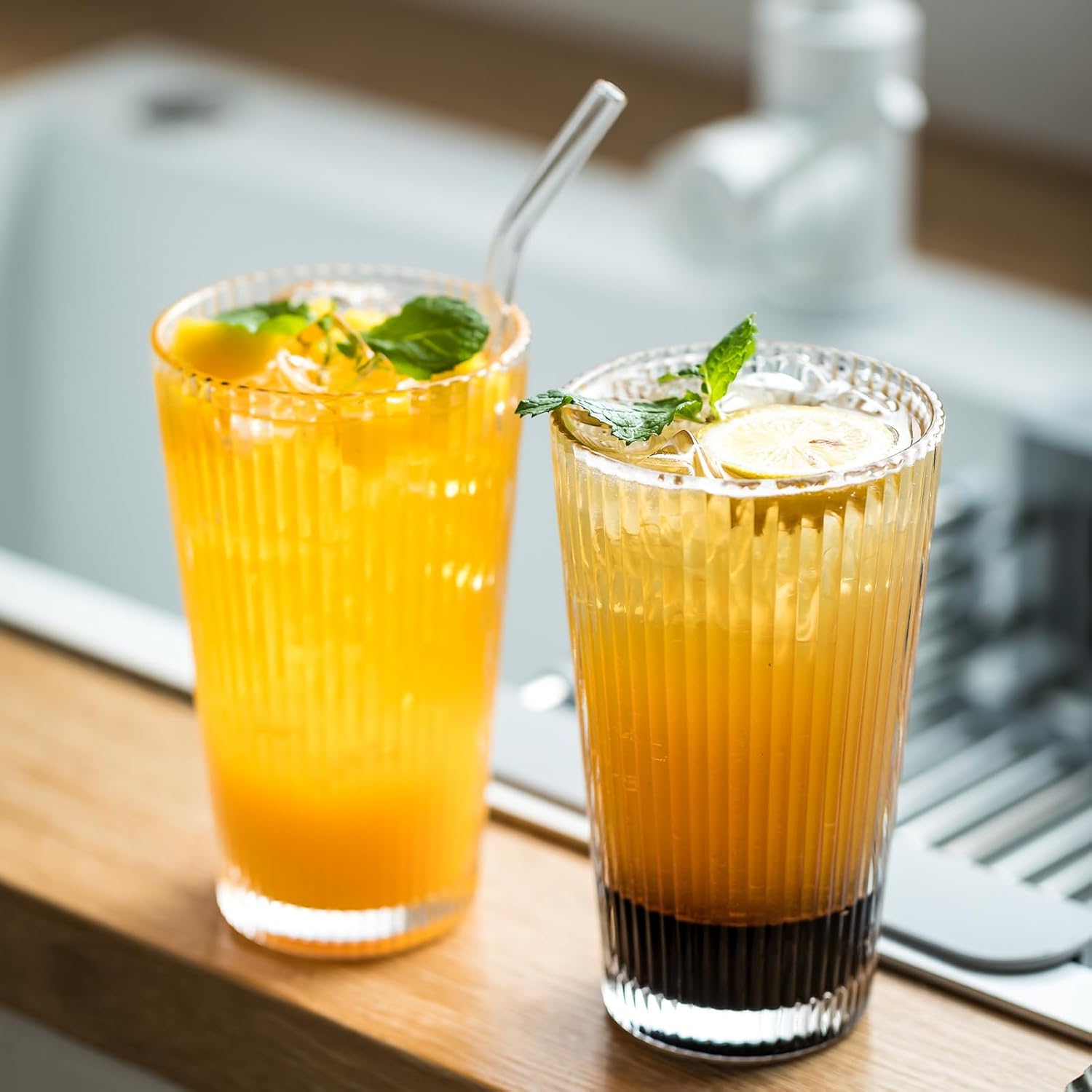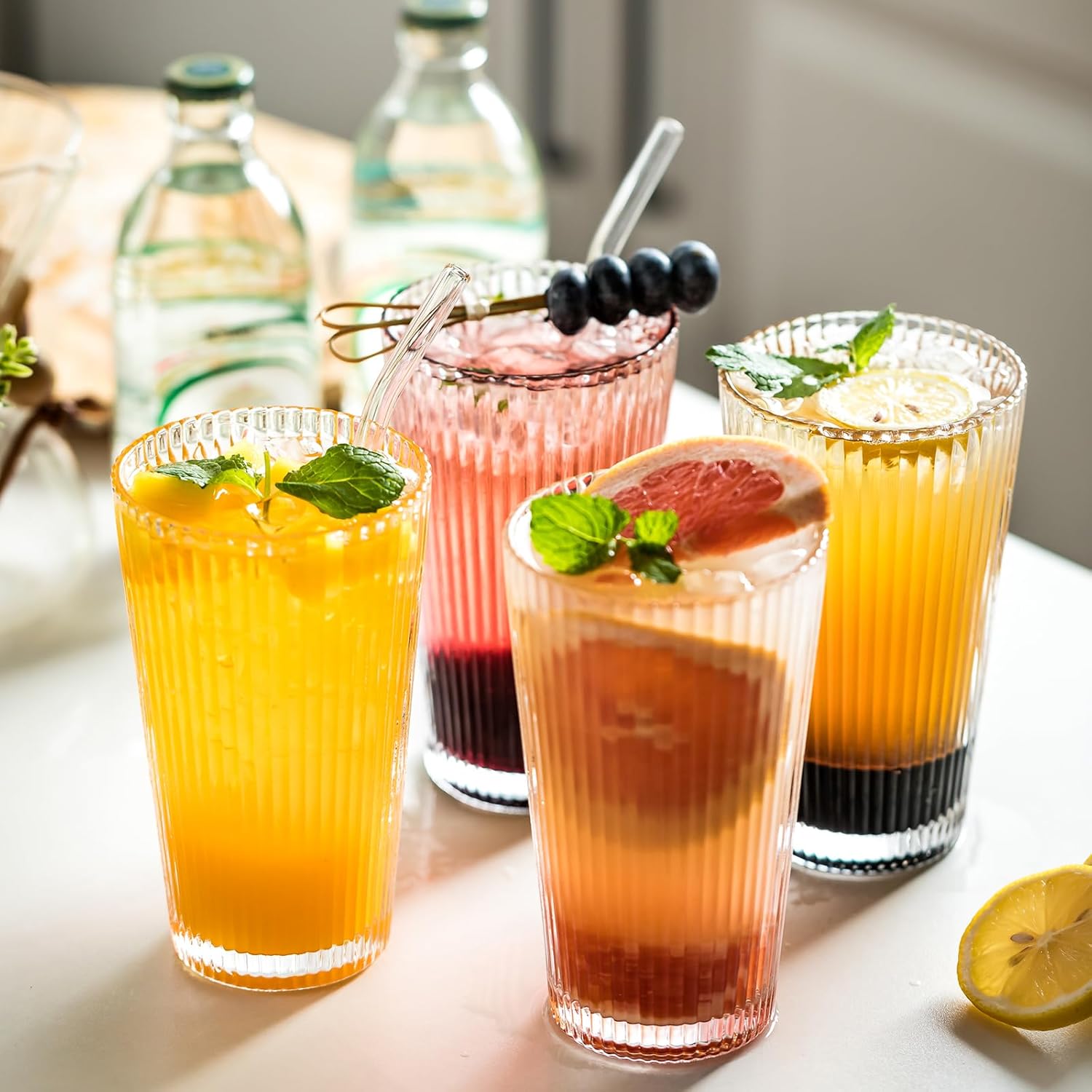 KEMORELA 12-Piece Vintage Ribbed Glassware Set, Old Fashioned Glasses, 16oz Clear Drinking Glasses with Straws, Ideal for Party and Casual Drinking - Classic Design for Any Occasion