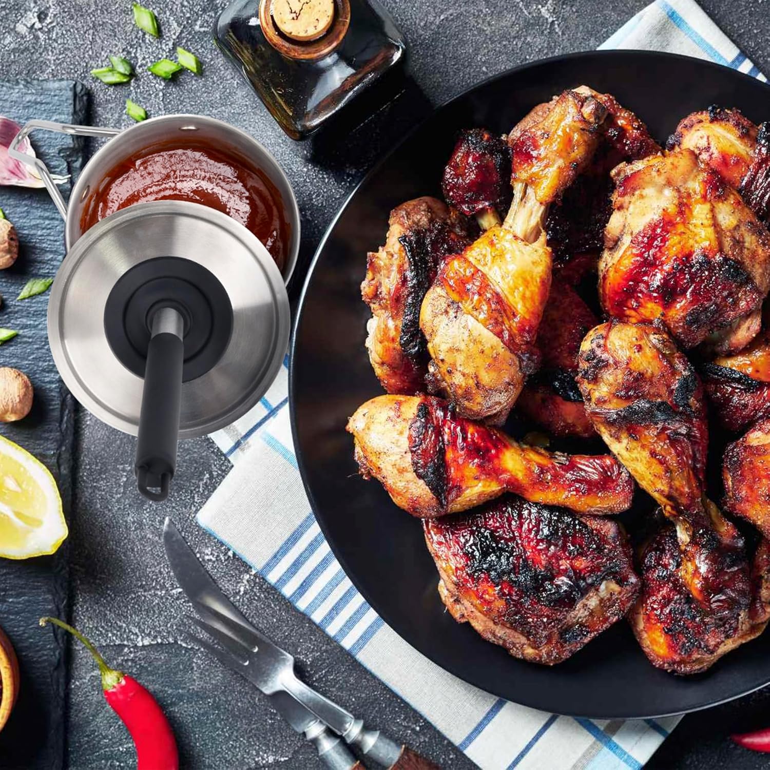 - Integrated Brush-lid Design: No more putting the brush down on the counter surfaces and leaving sticky bbq sauces everywhere. The brush-lid stays flush and in place, no more spills or extraneous mess caused by dripping. The lid provides some protection from the grill/smoker heat, keeps the sauce safe from debris and bugs outside and keeps sauces warm and fresh. A must if you smoke or grill!