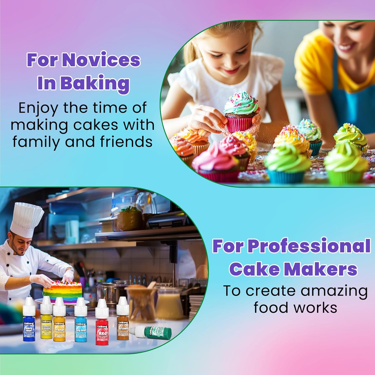 - Easy to use: Thanks to its high concentration, just a few drops of the food dye are all you need to achieve vibrant colors. With an upgraded dropper and squeeze bottle design, you can easily control the number of drops added, allowing for precise color mixing and customization. Whether it is a beginner or a frequent baker, you can easily use food coloring, which can help them easily add color to cakes, cookies, and other desserts to enhance the visual effect.