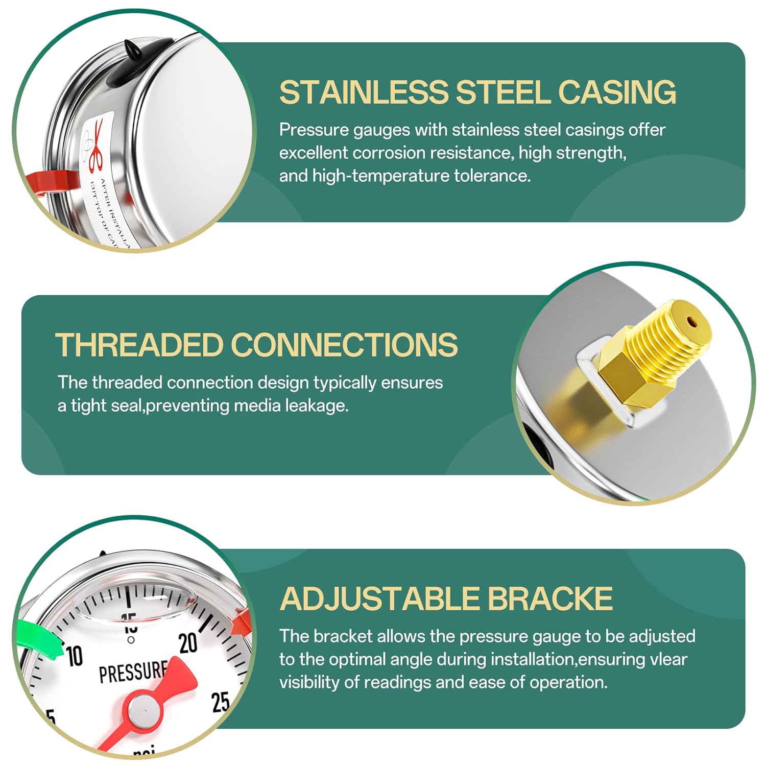 - [MATERIAL FEATURES] 304 stainless steel housing, corrosion-resistant, glycerin filled for stable readings and to avoid vibration damage.