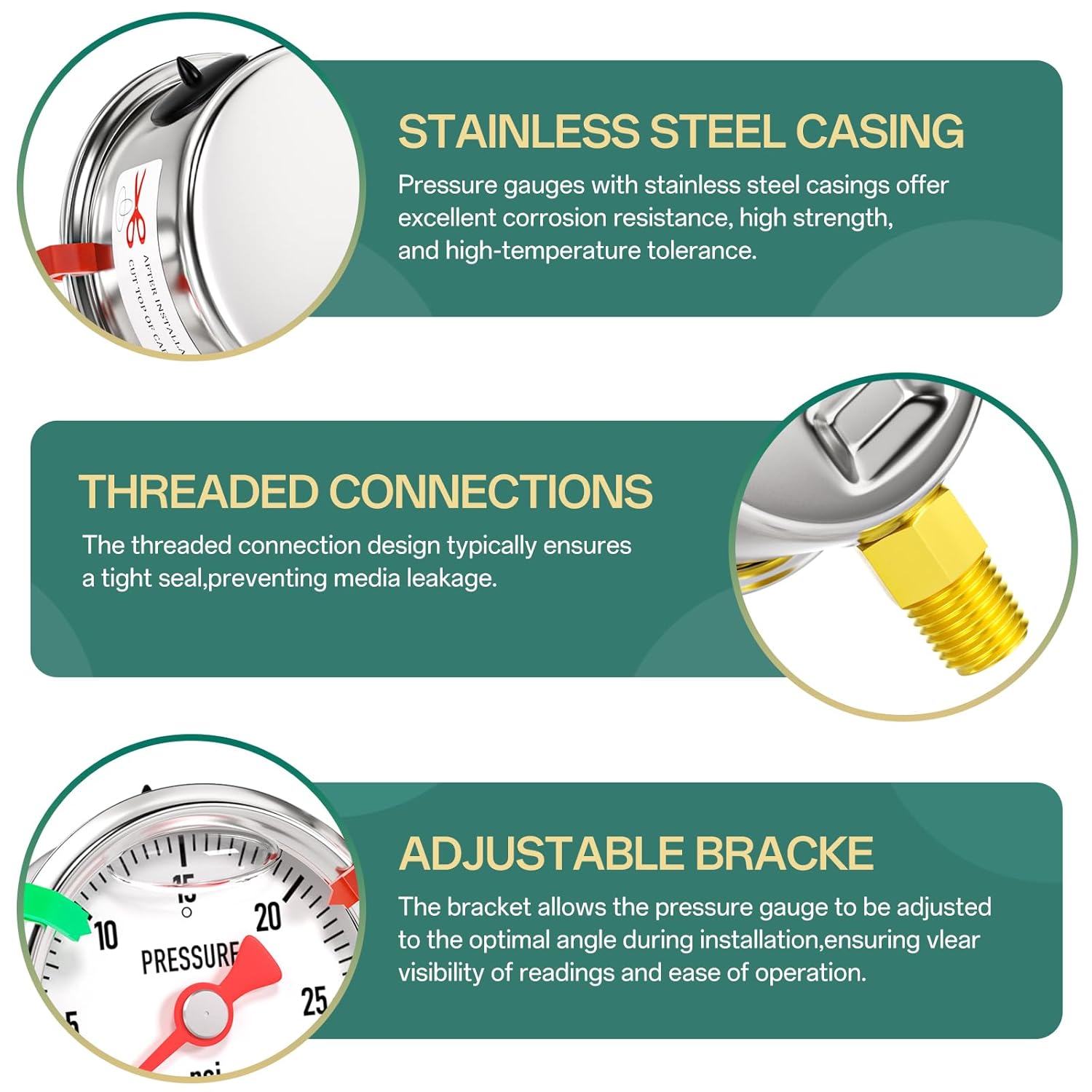 - [MATERIAL FEATURES] 304 stainless steel housing, corrosion-resistant, glycerin filled for stable readings and to avoid vibration damage.