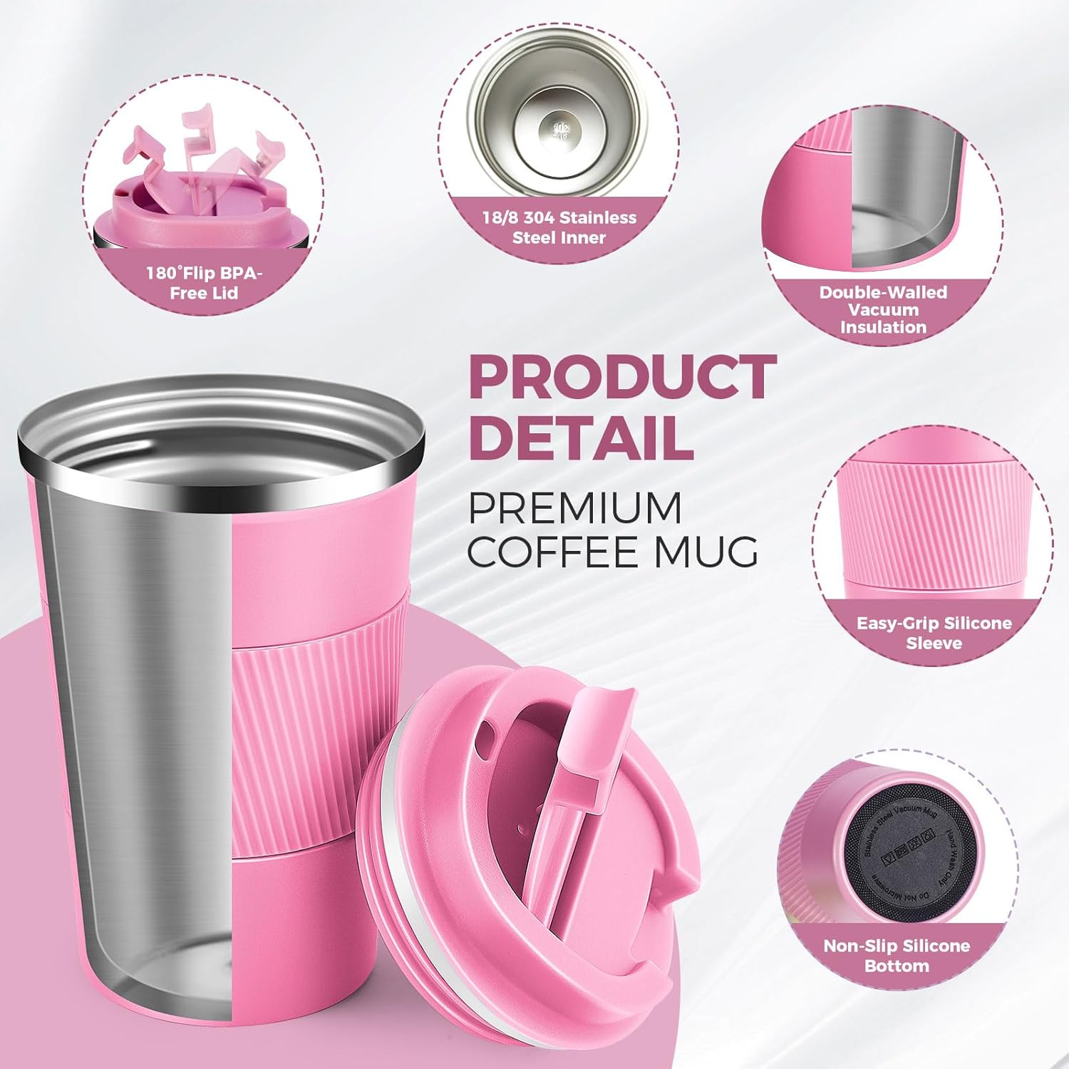 Volhoply 13 oz Stainless Steel Insulated Travel Coffee Mug with Fip Lid Bulk 2 Pack,Reusable Double Wall Vacuum Metal Coffee Cup,Portable Leak Proof Thermal Tumbler for Hot & Cold Drinks(Pink,2)