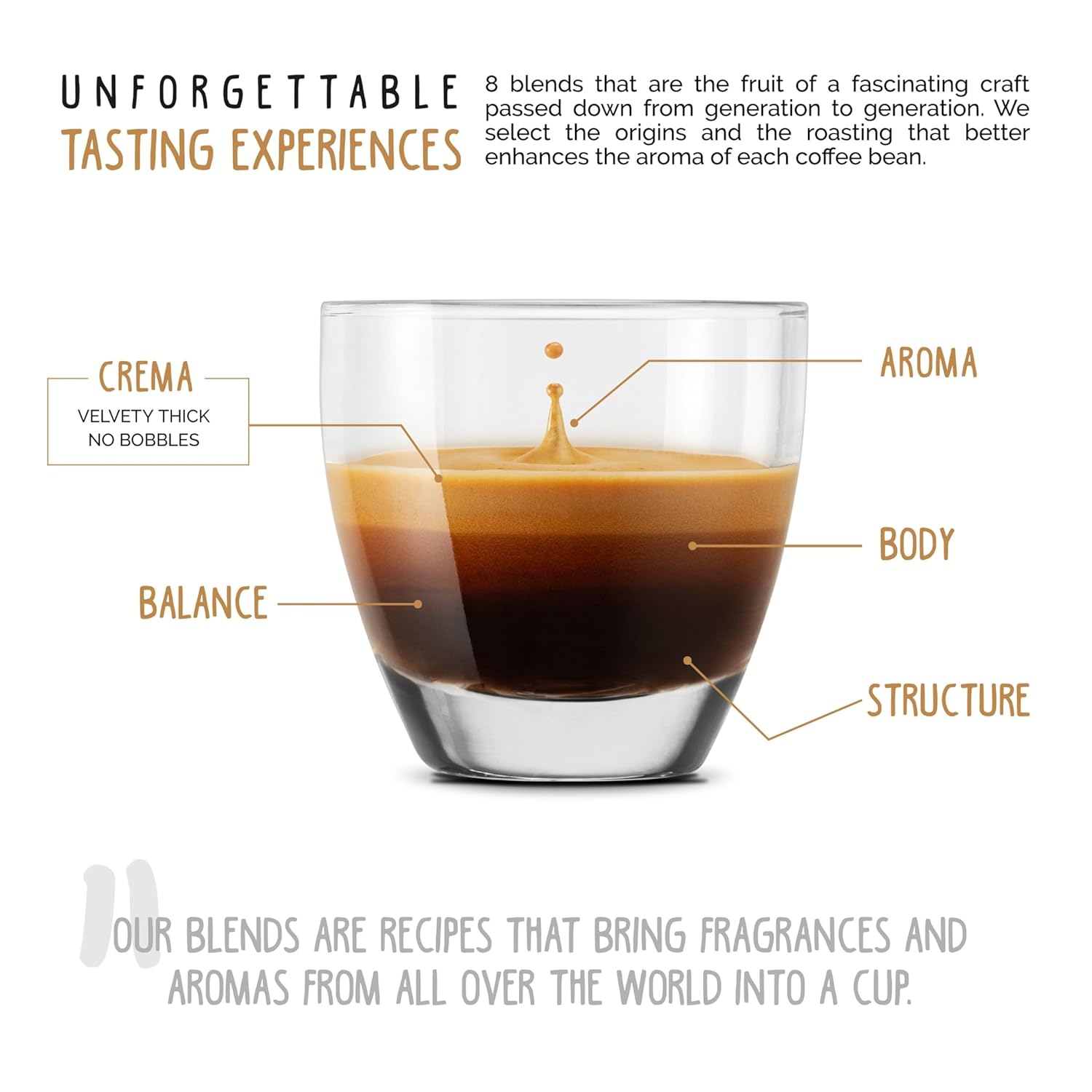 - Rich and Aromatic Flavor Profile: Our Espresso blend boasts a balanced intensity of 7/10, offering a rich and full-bodied coffee experience. The harmonious blend of Arabica and Robusta beans creates a robust and fragrant cup, featuring notes of chocolate, caramel, and nuts, complemented by a subtle spicy flavor that adds depth and complexity to each sip.