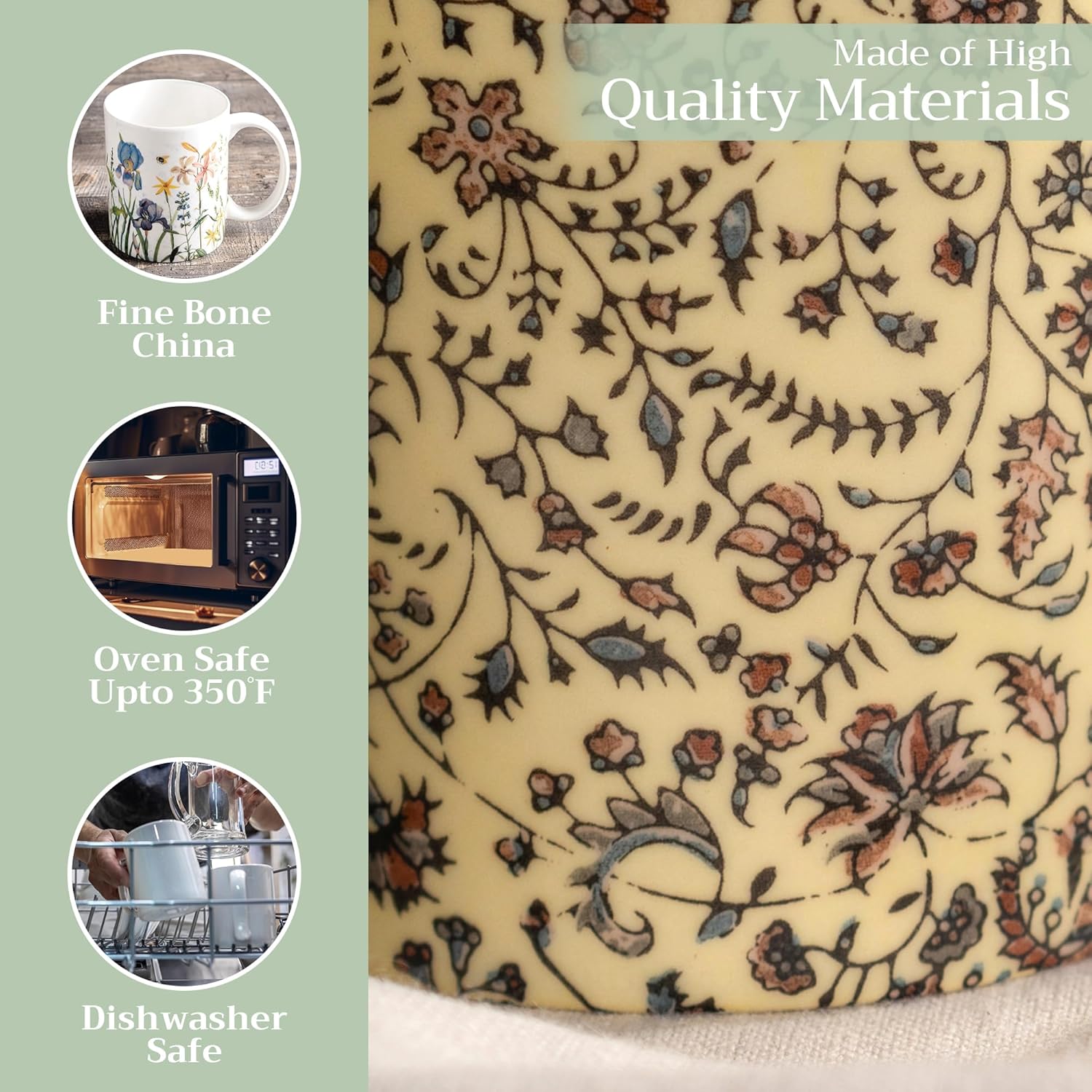 - Easy Care & Maintenance: Microwave, dishwasher, and oven safe up to 350°F. These bone china mugs are built for convenience and durability, making cleanup and reheating simple without compromising on quality
