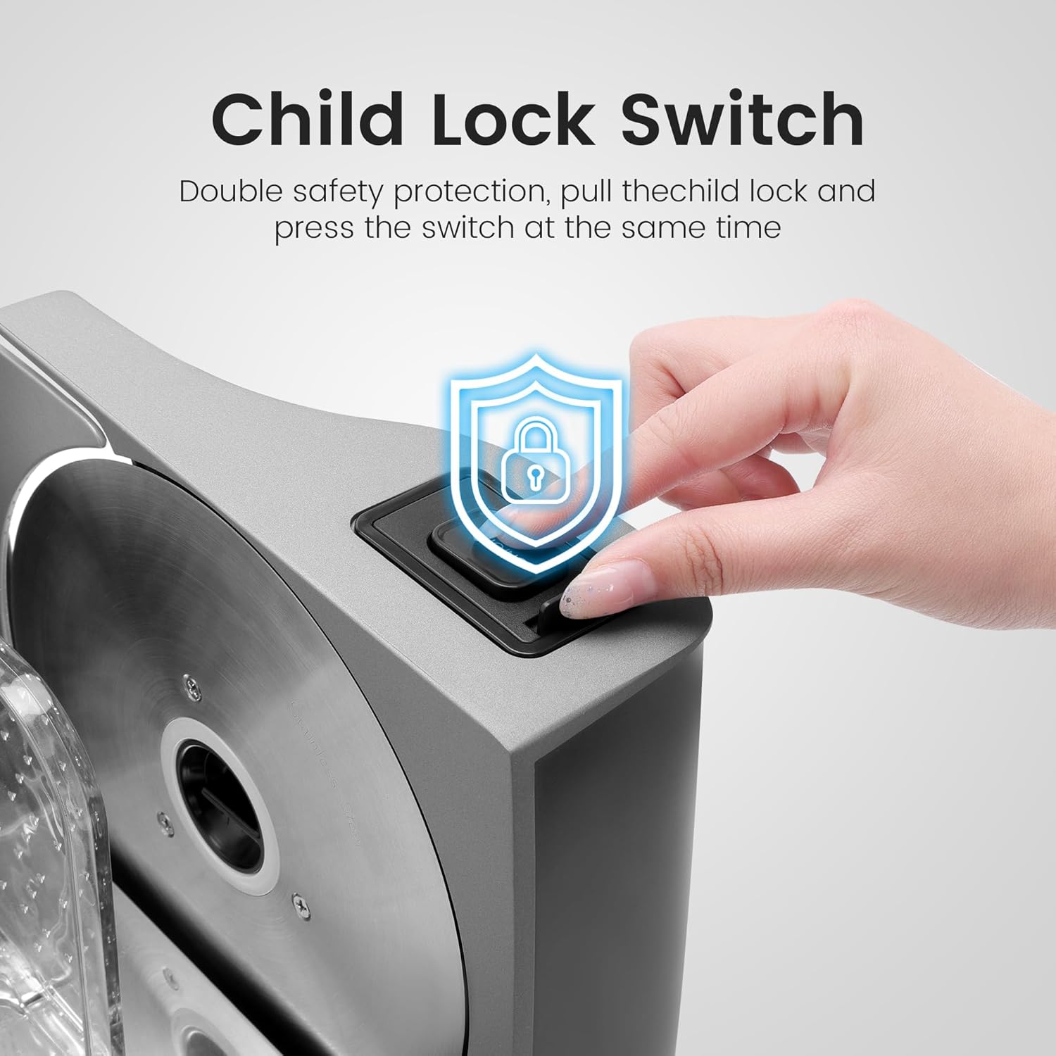 - Safe and Reliable- the slicer is equipped with a child lock switch and non-slip suction feet and is equipped with a food tray and towel to give you a reliable safety guarantee