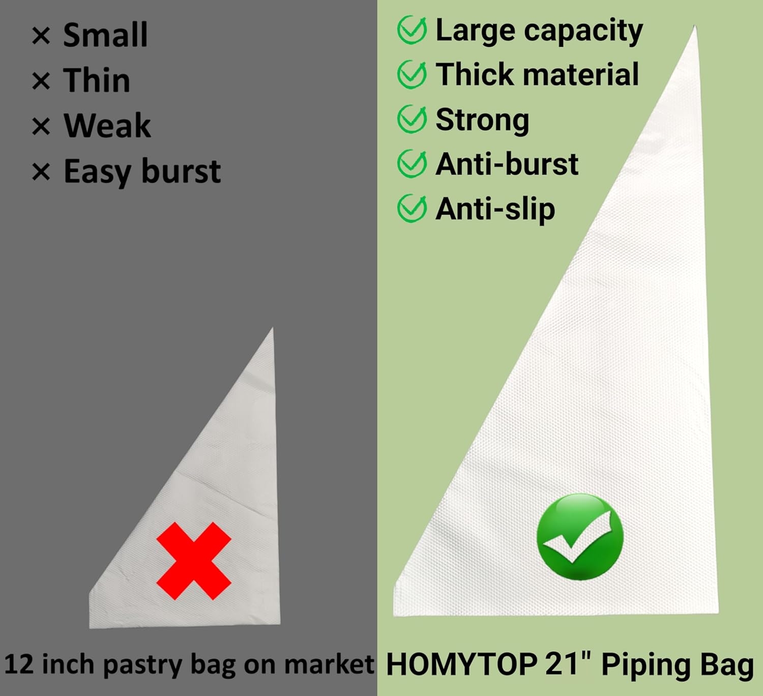 - Unparalleled Capacity: Our 21 inch piping bags boast a remarkable 1.5-liter volume, larger than most 12 and 16 inch piping bags in the market. Bid farewell to frequent bag changes and embrace uninterrupted creativity.