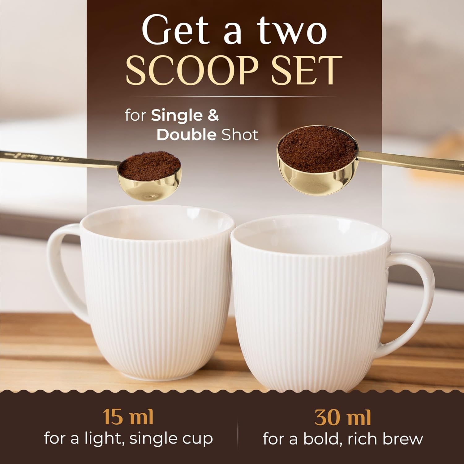 - GET THE RIGHT MIX - Brew the perfect cup of coffee every morning. Our set comes with 1 tbsp (15 ml) and 2 tbsp (30 ml) coffee scoops, so you can get the right amount of coffee every time.