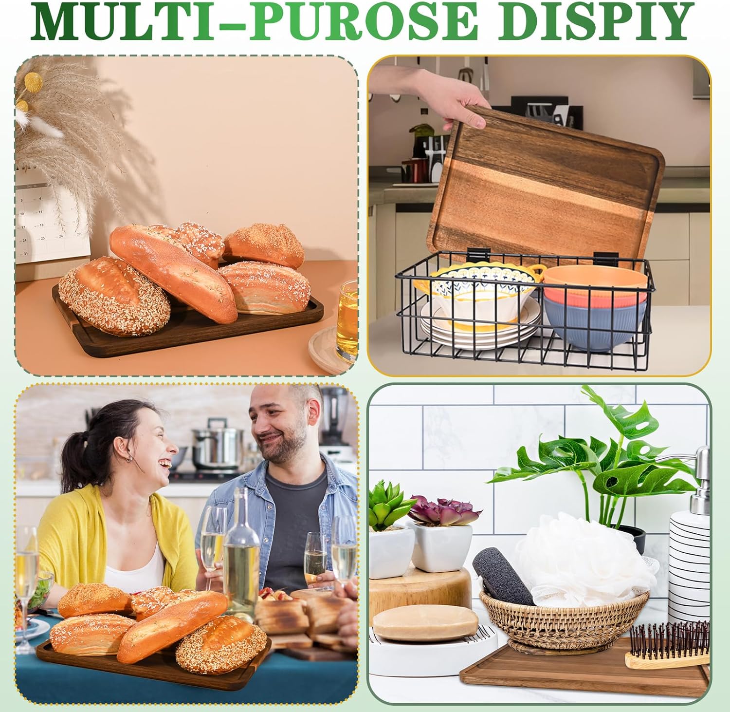 - MULTIFUNCTIONAL WOODEN PLATTER: Wooden display trays are widely used, not only as food serving trays, but also as coffee table trays, entryway trays, decorative trays, etc. The wood tray is very suitable for bathroom, vanity, or coffee table to easily store items.