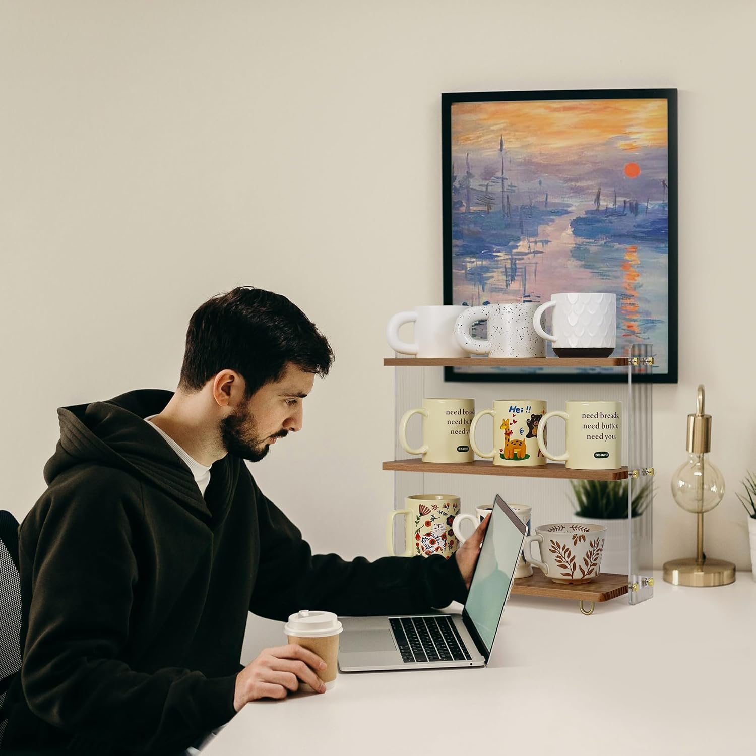- Stylish Design: Featuring wavy acrylic side panels and a natural wood board. The sturdy construction ensures that it can hold the weight of multiple mugs without wobbling or tipping. this organizer presents an aesthetically pleasing texture, ideal for coffee bar enthusiasts and those who love to decorate their spaces.