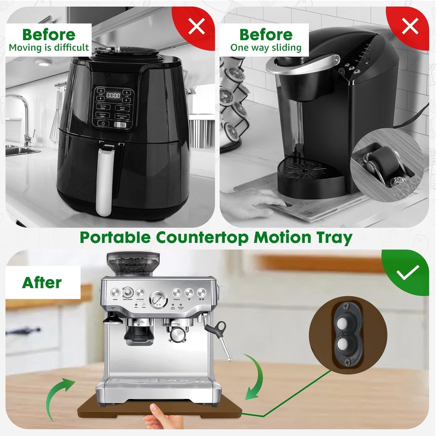 - 【360° Countertop Mobility】The appliance slider is equipped with 360° rollers for all-around mobility, making it easy to move various kitchen appliances.