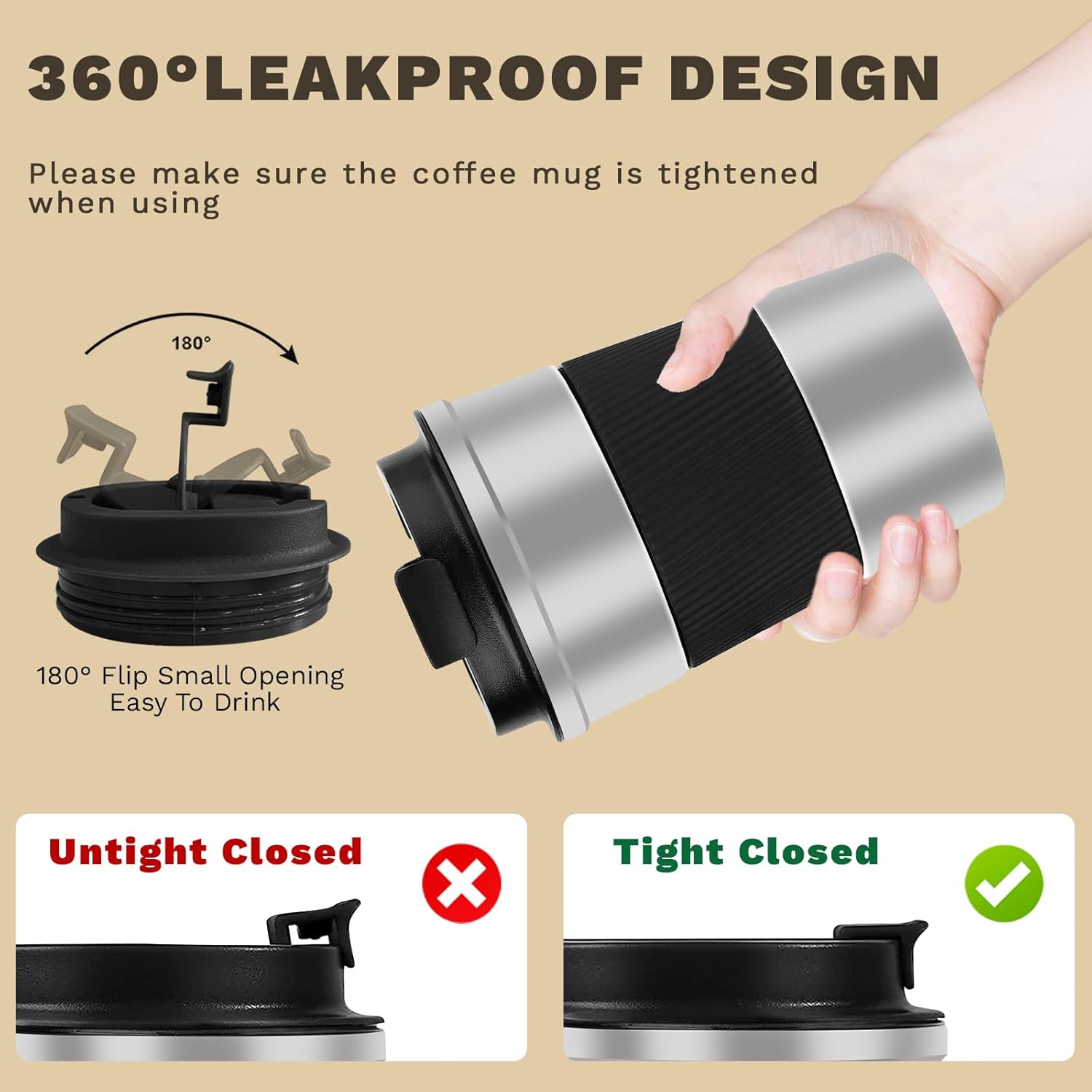 Vacuum-Insulated Stainless Steel Travel Coffee Mug, Leak-Proof Reusable Coffee Cup with Lid - Keep Hot & Cold Drinks for Hours, Durable Thermos Tumbler for Men & Women (3rd-Silver black, 12OZ)