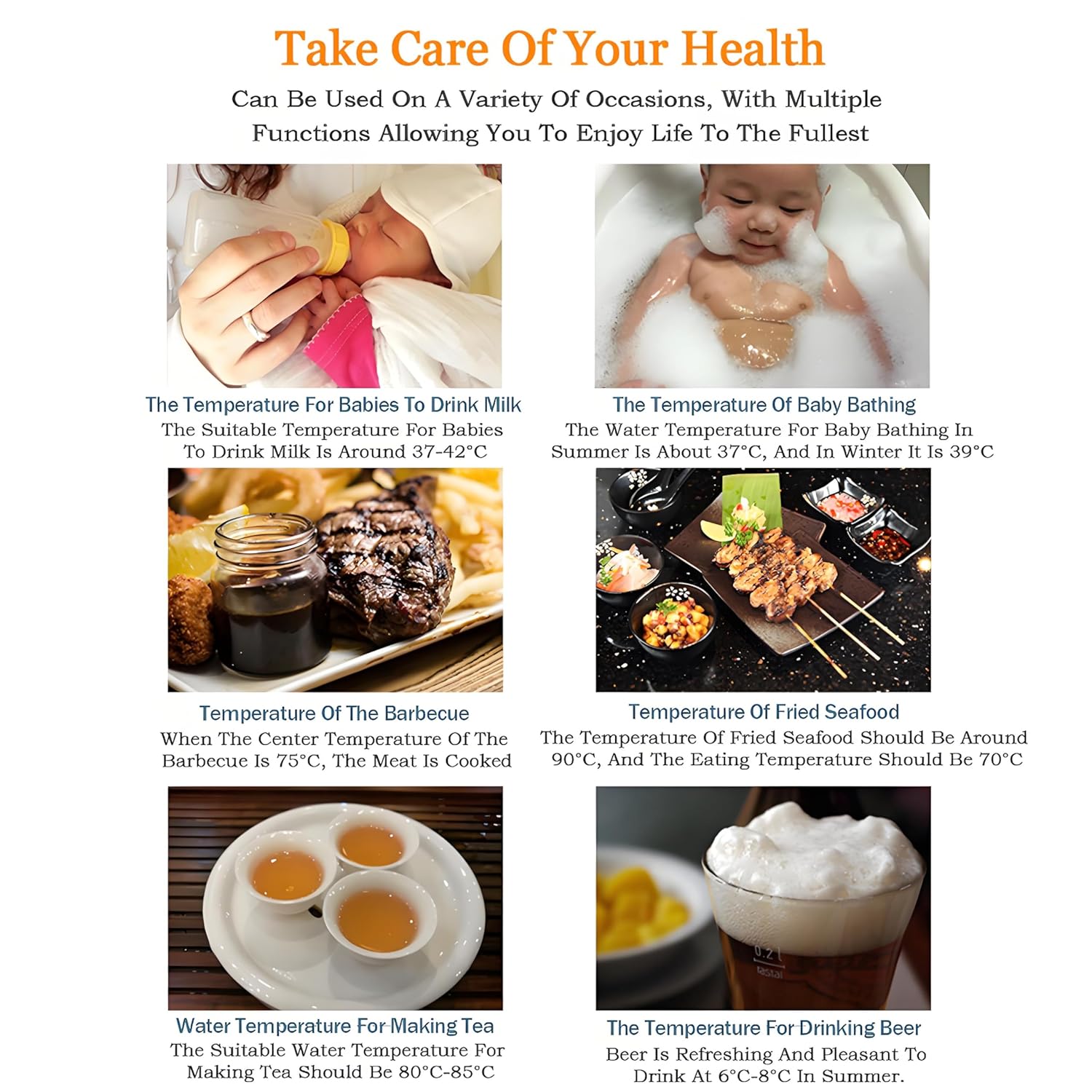 - HIGH PRECISION AND ACCURATE READINGS: Our digital food thermometer delivers precise temperature control with advanced technology, ensuring your meals are cooked to perfection every time. Water thermometer with accuracy of ±1℃ (±2°F). Wide temperature range from -58°F to +572°F (-50°C ~ +300°C).