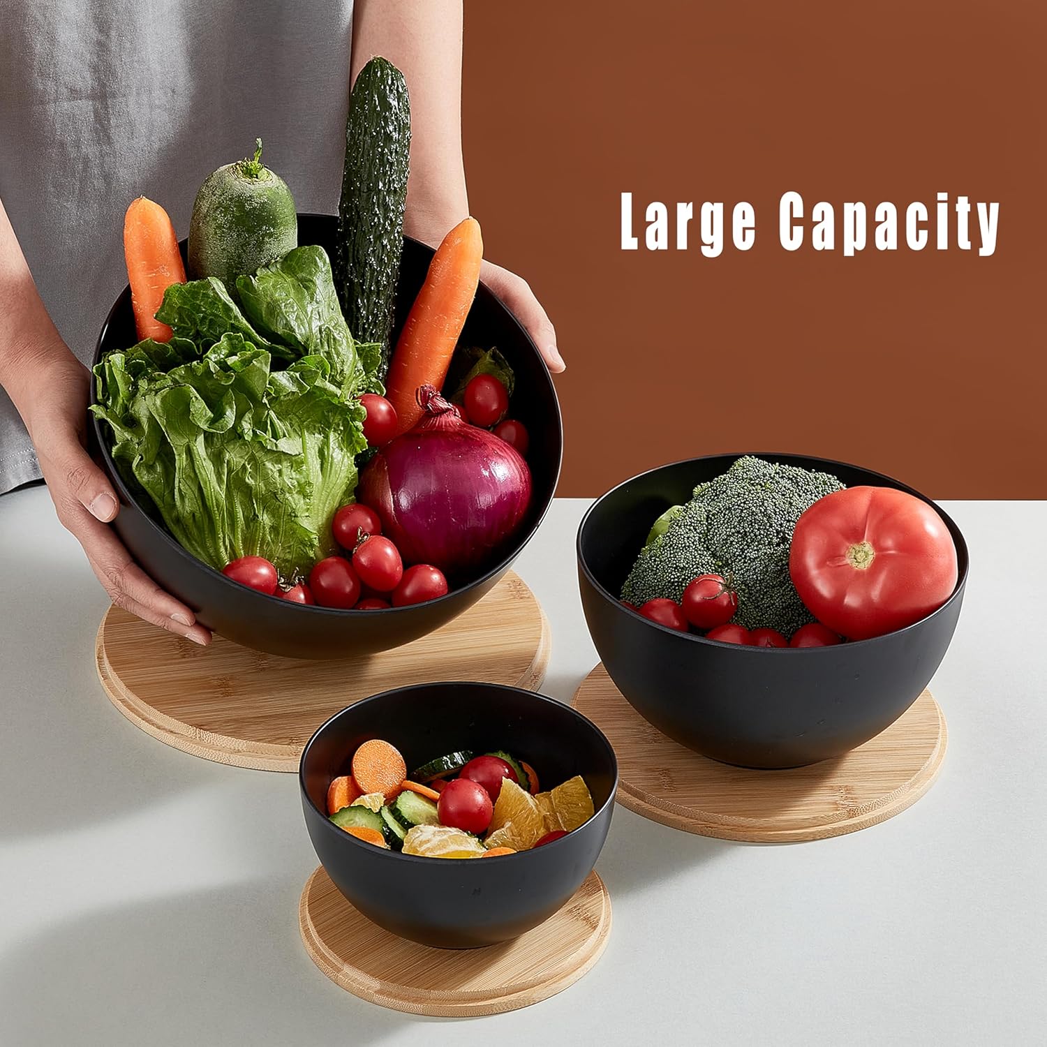 JOYMAY Salad Bowls, Mixing Bowl Salad Bowl Set, Natural Bamboo Fiber Serving Bowl Set of 3 with Bamboo Wood Lid, Nesting Bowls for Salads,Pastas(Black,10",8",6")
