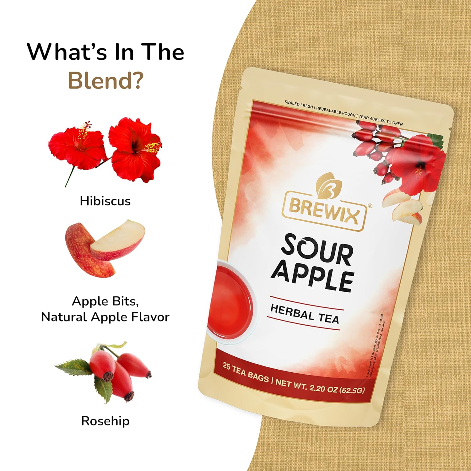BREWIX, Sour Apple Hibiscus Tea Bags (25 Pyramid Tea Bags) Caffeine-Free Herbal Tea | Apple, Hibiscus, Rosehip | Refreshing Wellness Brew for Any Mood | Hot or Iced Refreshment