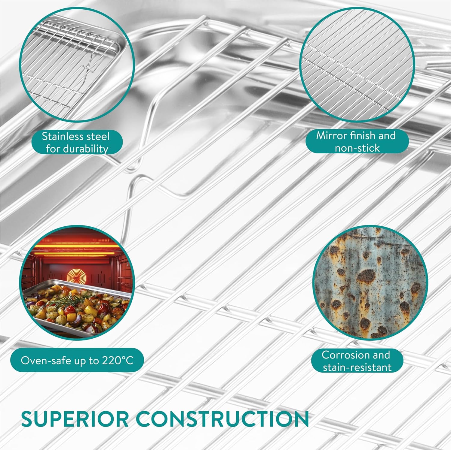 - High-Quality Materials: Each wire rack and baking sheet is made of high-quality 18/0 stainless steel, providing you with sheet pans and wire rack inserts that are built to last
