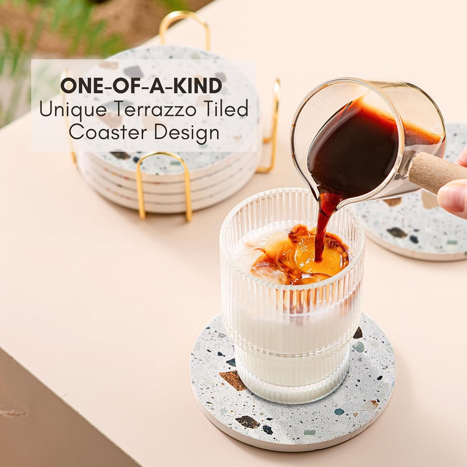 Terrazzo Drink Absorbent Coasters with Holder Set of 6, Ceramic Coaster for Drinks, Coffee Table Decor, Water Absorbing Stone Coaster for Drinks (Granite)