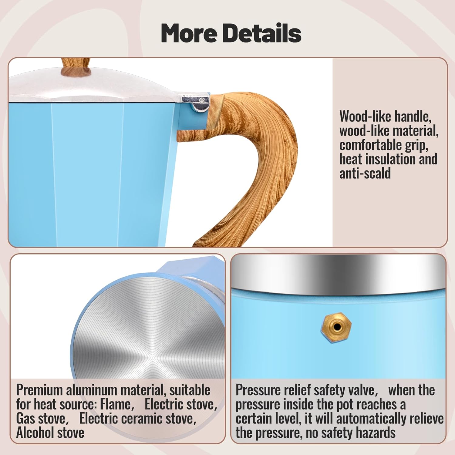 - Robust Durability: Crafted meticulously from high-quality cast aluminum, our Moka pot is built to last. Experience the ultimate durability and enjoy thorough heat distribution for an enhanced coffee flavor, captivating aroma, and consistent results. The flip-top lid with a heat-resistant knob and handle ensures safe and effortless pouring