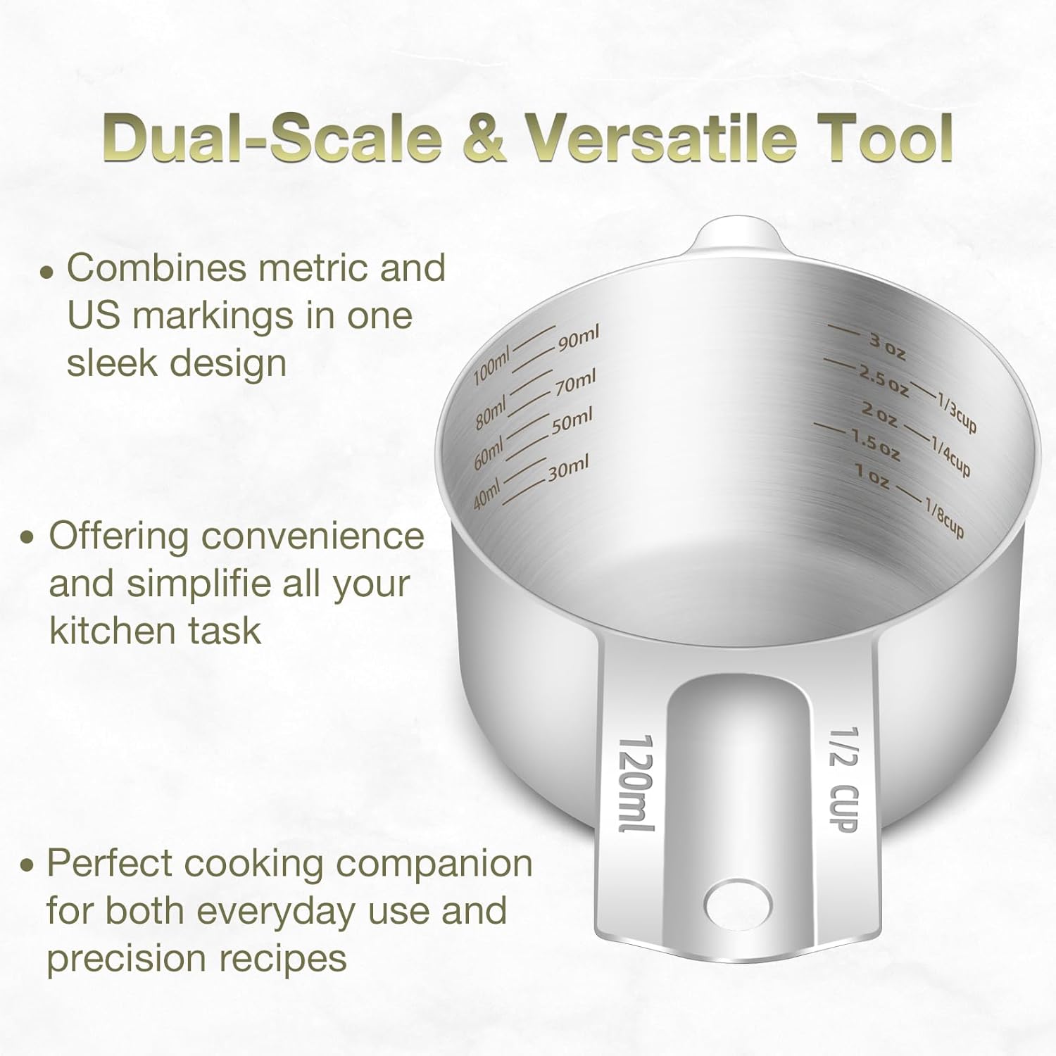 - Dual Scales Available - Engraved clear and accurate METRIC & US scales on the inner side will never fade and can be seen forever. It can meet different needs and let you know the amount to add in every time. The all measurement contains 1/2cup(4oz), 3oz, 1/3cup, 2.5oz, 1/4cup(2oz), 1.5oz, 1/8cup(1oz), 100ml, 90ml, 80ml, 70ml, 60ml, 50ml, 40ml, 30ml