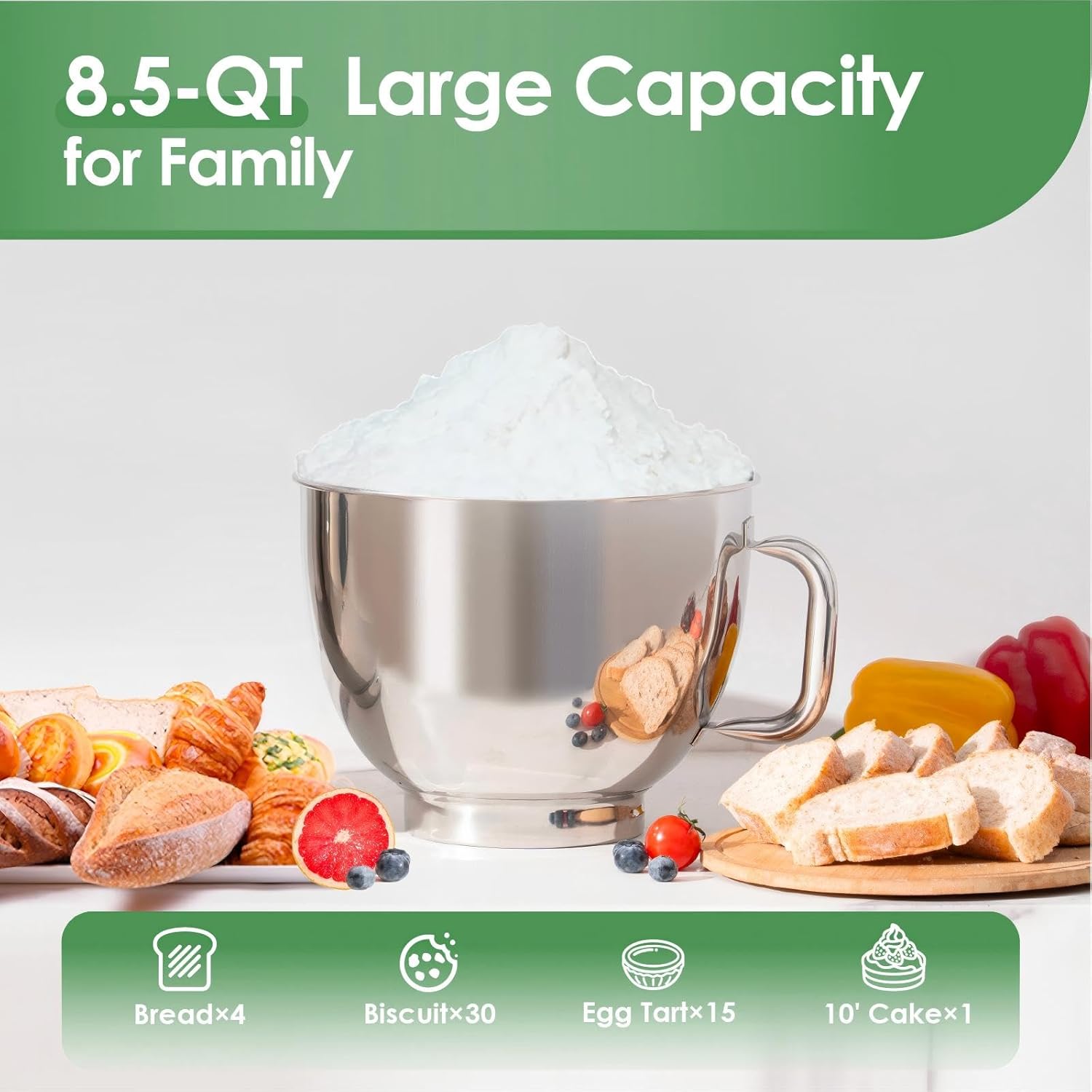 - 8.5 QT High Capacity: Our stand mixer comes with an 8.5 QT stainless steel bowl, providing ample space for preparing large batches of dough, batter, or mixtures. It's ideal for family meals, gatherings, and large-scale baking projects. The convenient single-handle design allows for easy lifting and pouring with hands.