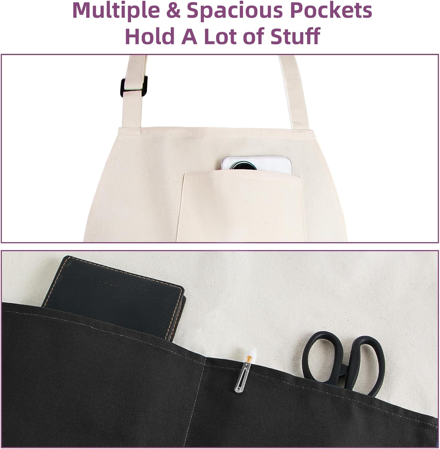 - All the Pockets You Need – Tools, Towels, and More Equipped with multiple deep pockets, this apron holds everything from spatulas and tongs to phone and notepads. Plus, a built-in towel loop keeps your dish towel always within reach – no more searching while you cook!