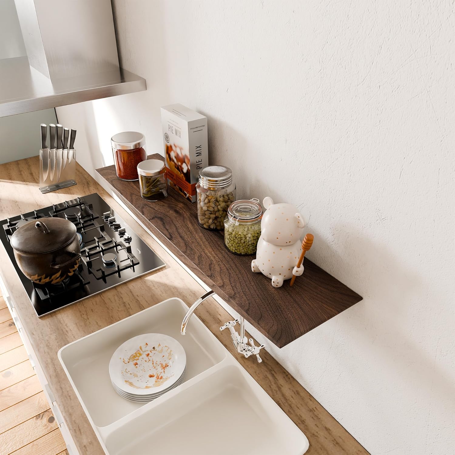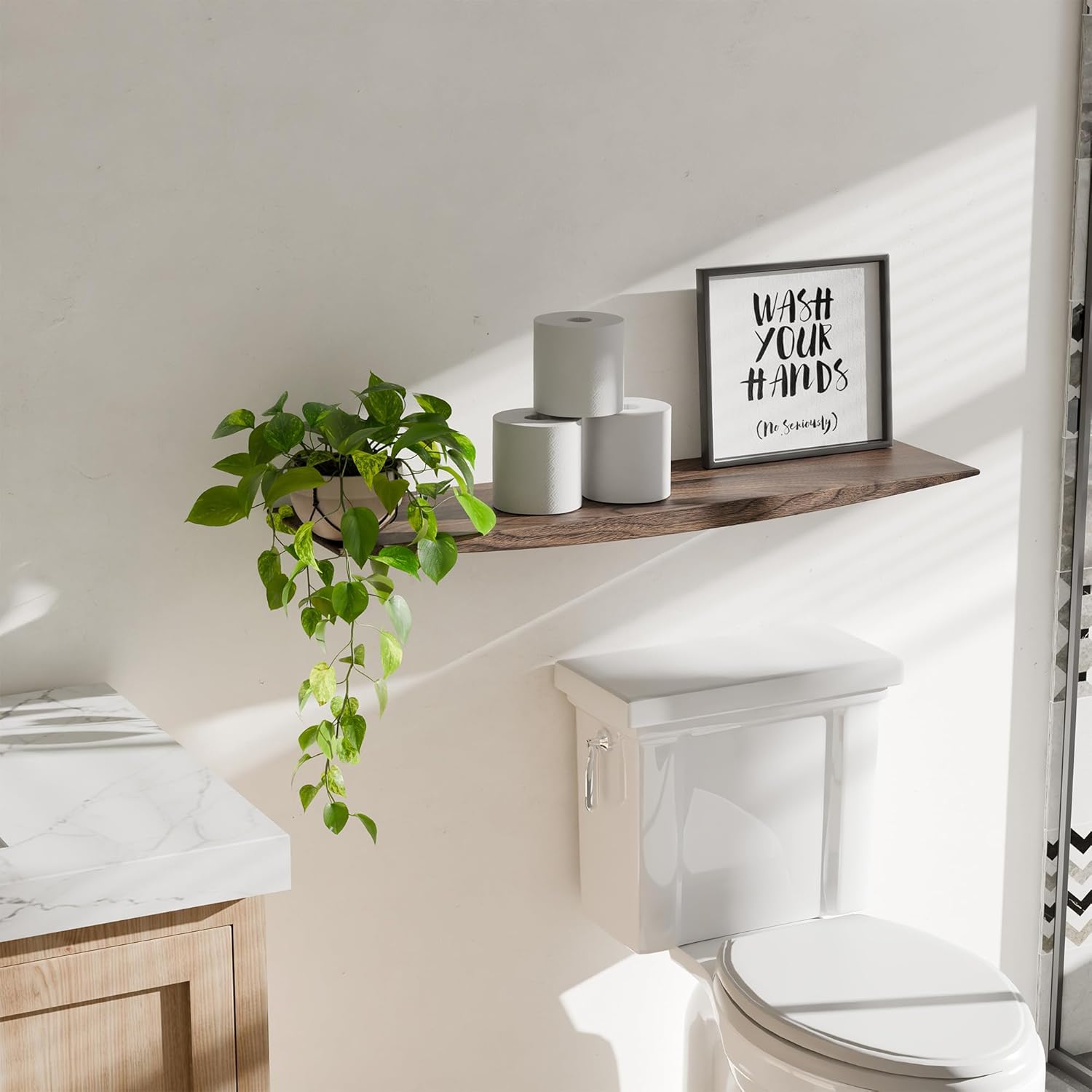 - 24’’Solid Walnut Floating Shelf: This floating shelf is made from natural black walnut wood, featuring a unique arc thickness design that showcases its natural beauty, perfectly blending with any home style, especially rustic, modern, or Zen decor.