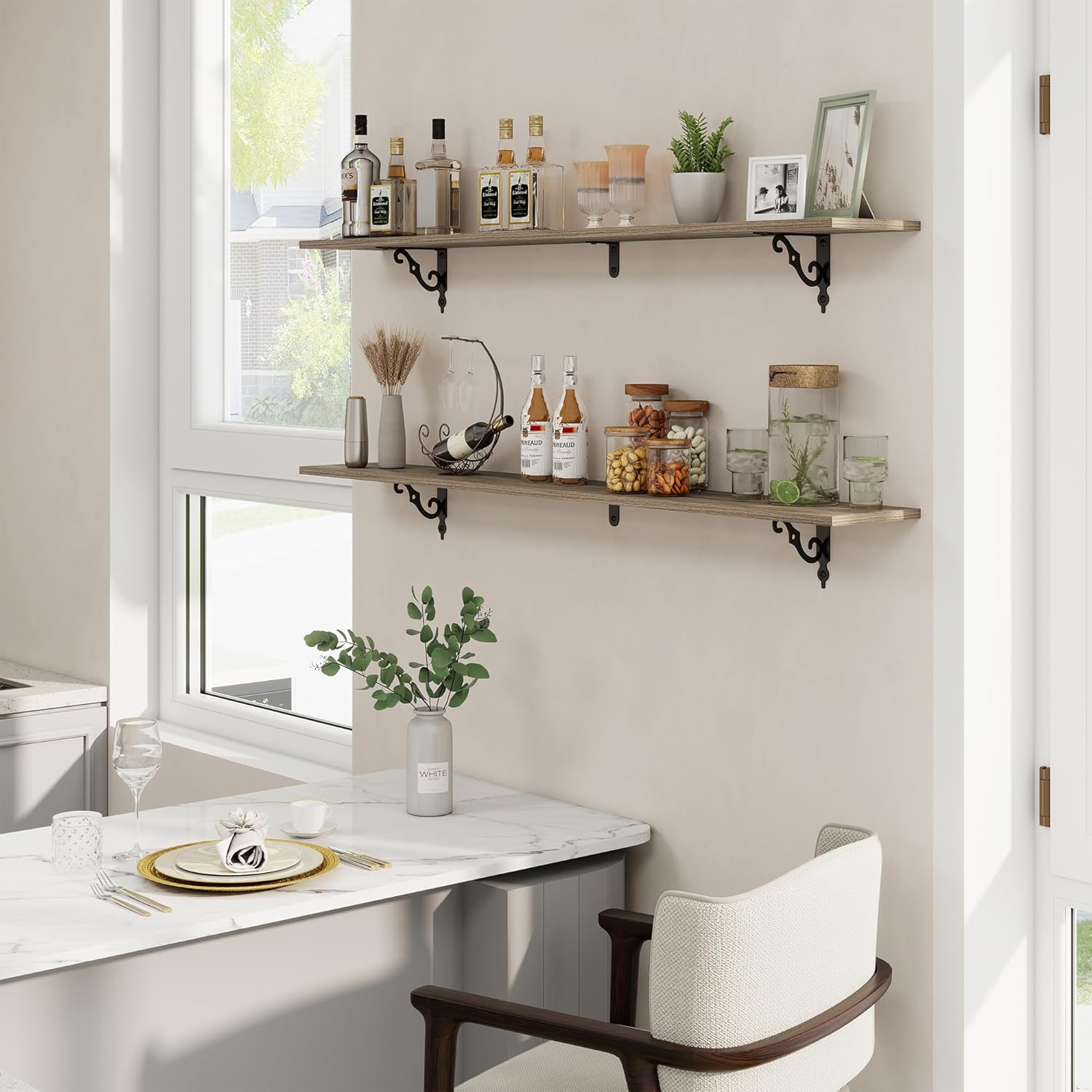 RICHFOCUS Floating Shelves for Wall Decor, 55.1W x 8D Shelves Set of 2, 8 Inch Deep Rustic Wood Shelves Wall Mounted with Brackets, Long Floating Shelves for Living Room Bedroom Kitchen, Grey