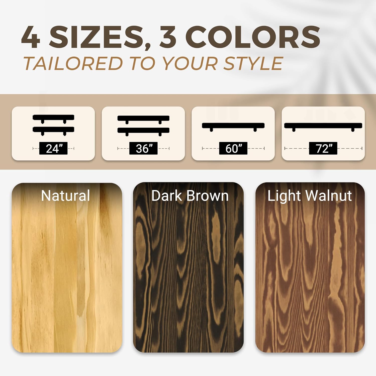 - ✅[𝐒𝐢𝐳𝐞𝐬 𝐭𝐨 𝐒𝐮𝐢𝐭 𝐘𝐨𝐮𝐫 𝐍𝐞𝐞𝐝𝐬]: Choose from 24", 36", 60", or 72" lengths and available in three finishes—Natural, Dark Brown, and Light Walnut, these shelves adapt perfectly to your storage and decor goals.