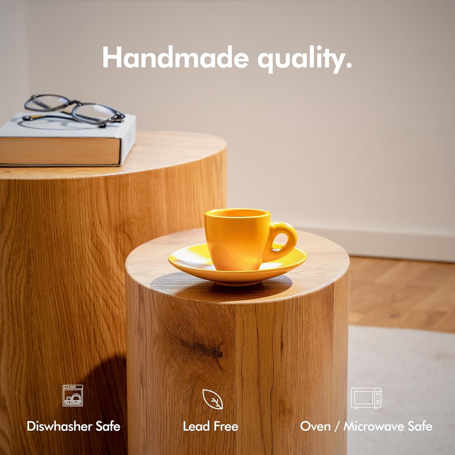 KIVY Espresso Cups Set of 4 [Set 4x 3oz]- Espresso Set Thick Walled Stoneware Espresso Cup Set - Italian Style Espresso Cups and Saucers - Espresso Mugs - Demitasse Cups and Saucers Sets - Yellow