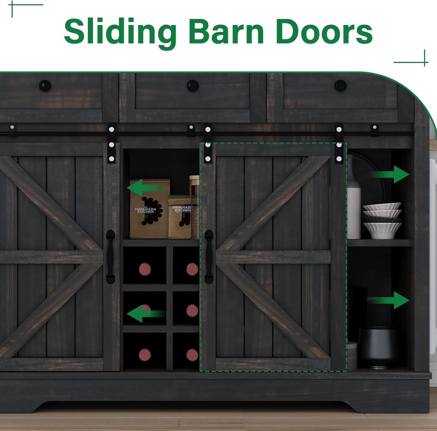 - Farmhouse Coffee Bar Cabinet: Kitchen hutch storage cabinet with 2 sliding barn doors is not only easy to access the items in the cabinet, but also adds a touch of rustic charm to the whole room, with black metal hardware to make the tall kitchen pantry cabinet more exquisite, and each cabinet has an adjustable shelf, convenient for storing items of different sizes, beautiful and functional