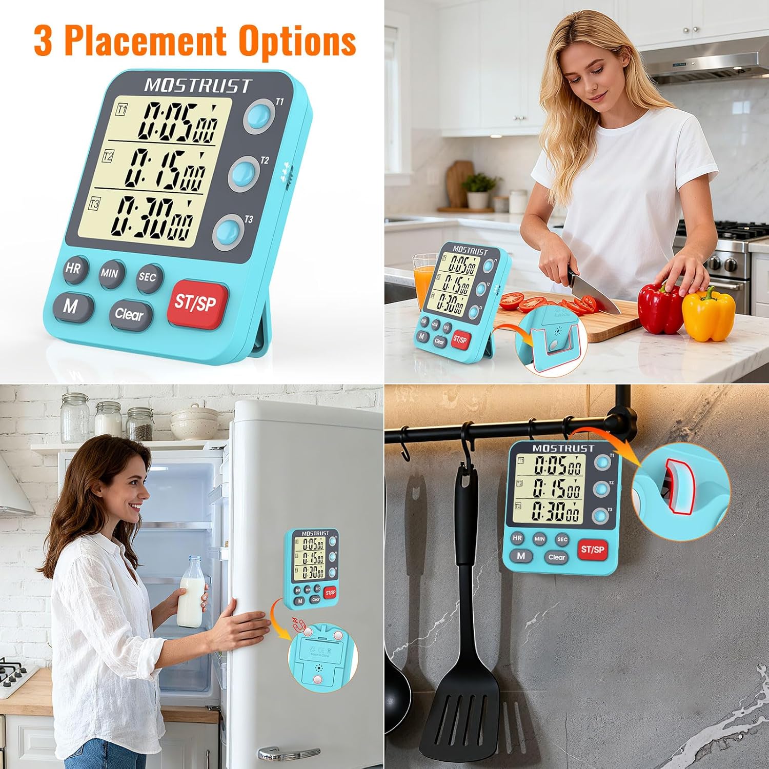 - 【MULTIPLE PLACEMENT OPTIONS】The 3 groups kitchen timer has strong magnetic back, retractable stand and hanging hole, it is convenient to place in three ways especially its 3 STRONG MAGNET working fine on the refrigerator