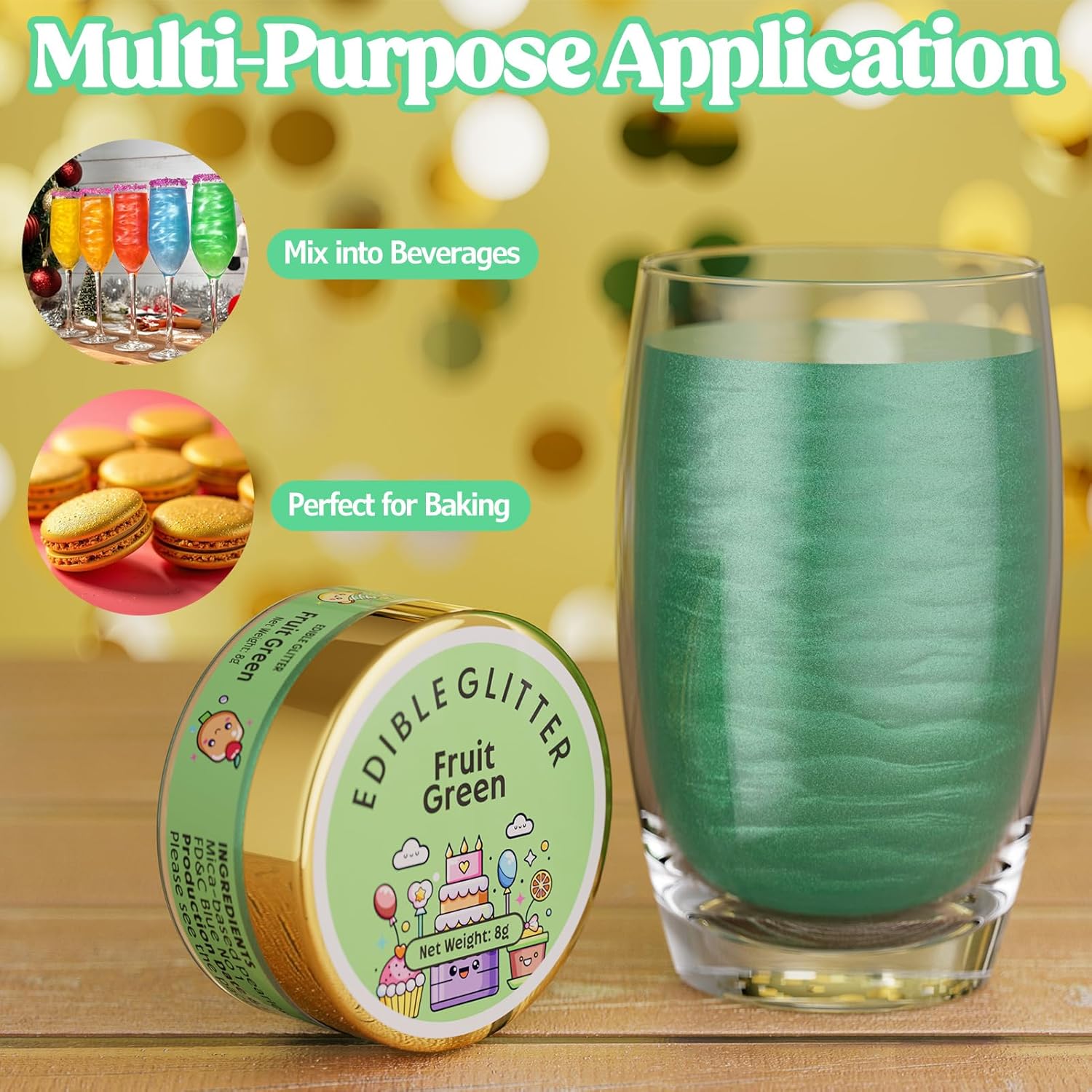 Nomeca Edible Glitter for Drinks Cakes, 8 grams Food Grade Luster Dust Sprinkles Glitter for Cake Decorations, DIY Cocktails, Beverages & Cake Decorating, Dessert Cake Topper (11-Fruit Green)