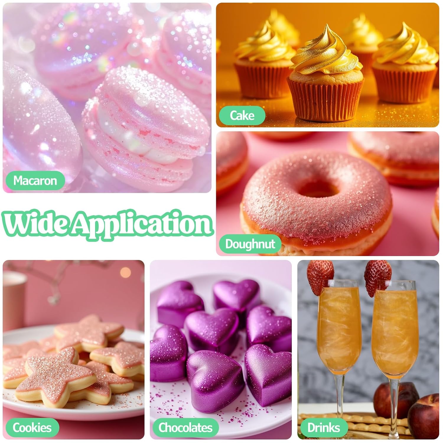 - Widely Used - This edible glitter is perfect for DIY wine, cocktails, champagne, drinks, beer, soda and more. it also can be sprinkled directly on the food, used to decorate cakes, cookies, chocolates, macarons, fruit platters, cupcakes, strawberries, lollipops, ice cream and more. It is also a great decoration for christmas, easter, halloween, thanksgiving, birthdays or any memorable holiday