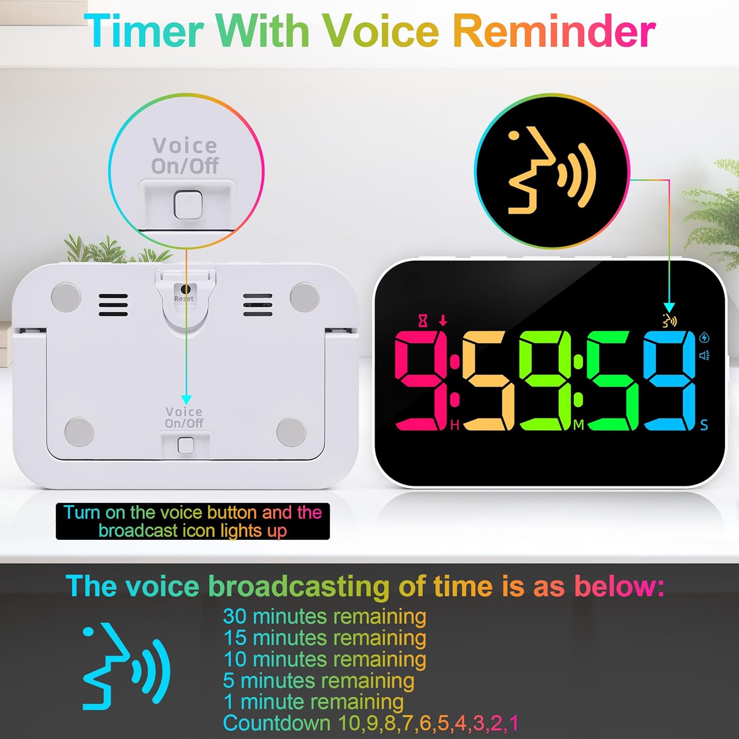 Kitchen Timer for Cooking, 10 RGB Color Rechargeable Digital Magnetic KidsTimer with Voice Reminder, Countdown/Up, 5”LED Display 3 Brightness 4 Volume Adjustable for Kids Classroom Home Gym-RGB