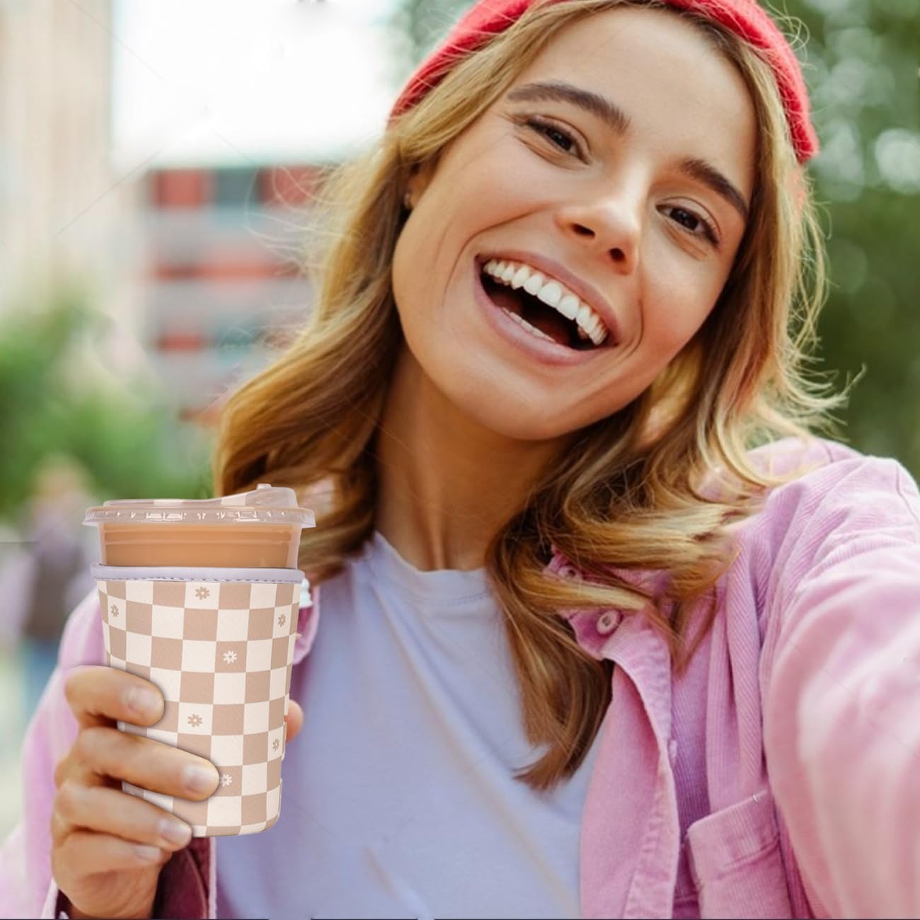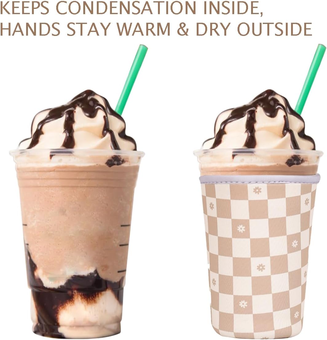 Reusable Insulated Neoprene Iced Coffee Cup Sleeve, Durable Drink Sleeve for Cold Beverages, Beverage Holder for Iced Coffee, Floral Checkers