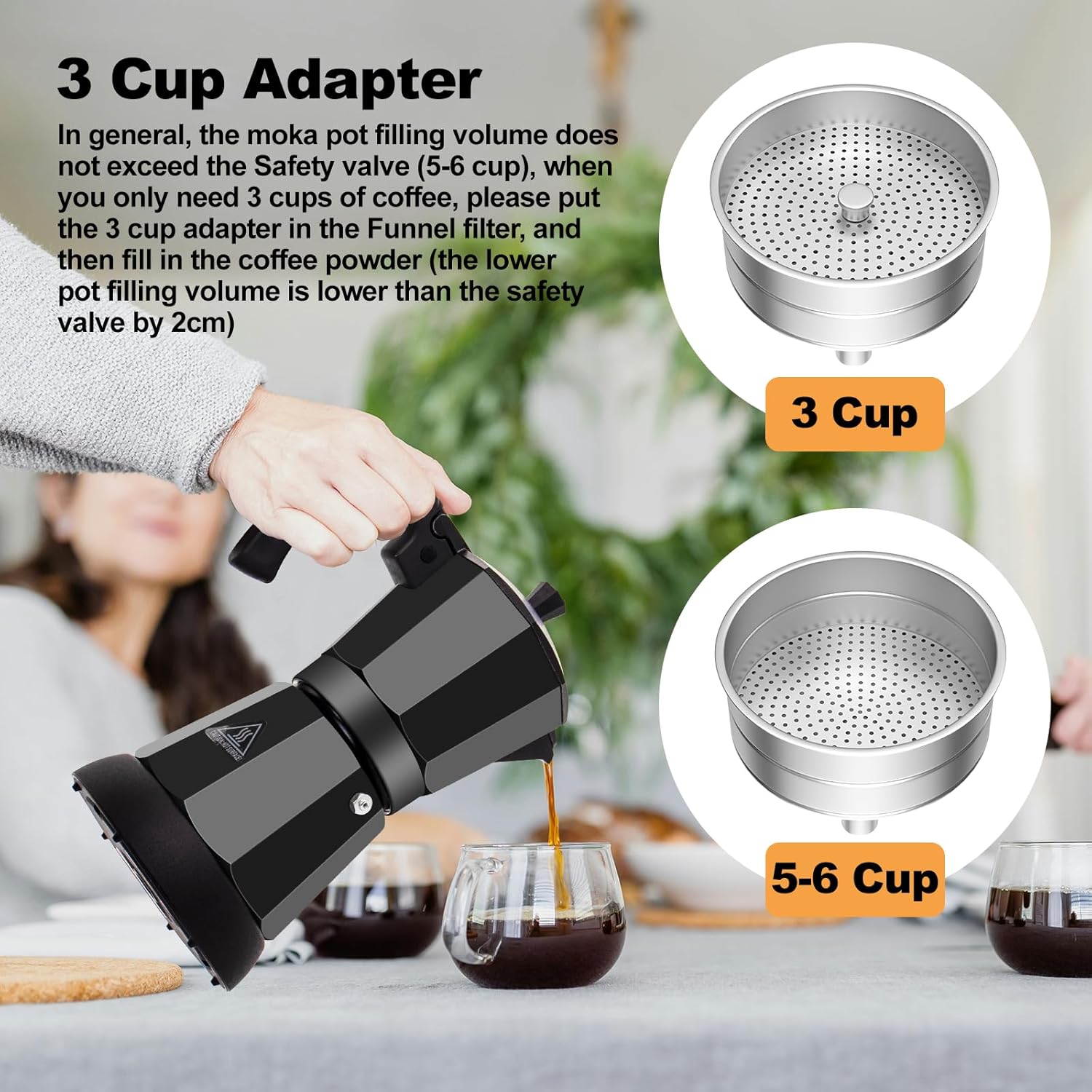 - 5-6 Cup Capacity: 5-6 cups large capacity to meet your needs. Meanwhile, we also have 3 cup adapter, when you only need 3 cups capacity, just put the 3 cup adapter into the Funnel filter first, then fill it with coffee powder, so you can have 3 cups capacity