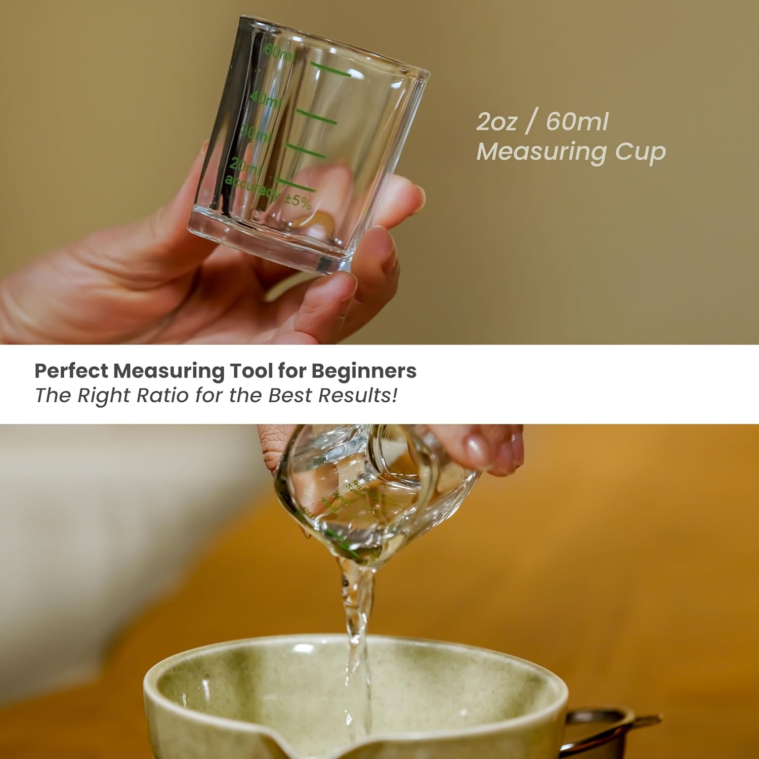 - MEASURING TOOL FOR BEGINNERS: Measuring glass (2oz/60ml) to help you easily get the precise powder/water ratio whether when making standard matcha flavor or exploring the unique taste to your liking. (NOTE: Measuring cup is not microwavable.)