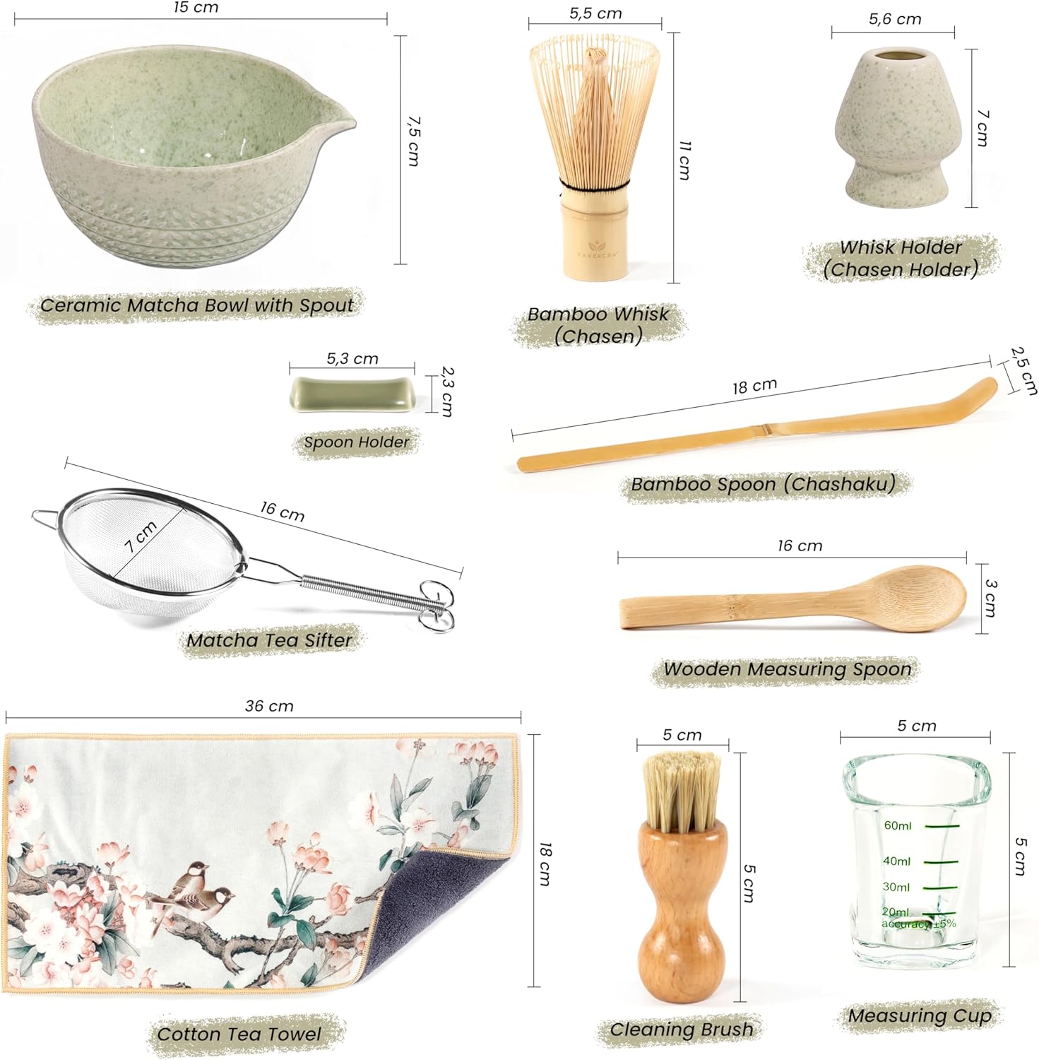 - YABERCHA MATCHA TEA SET (10 PCS): Ceramic Matcha Bowl with Spout, Bamboo Whisk (Chasen), Whisk Holder (Chasen Holder), Bamboo Spoon (Chashaku), Matcha Tea Sifter, Spoon Holder, Cotton Tea Towel, Wooden Measuring Spoon, Measuring Cup, Cleaning Brush