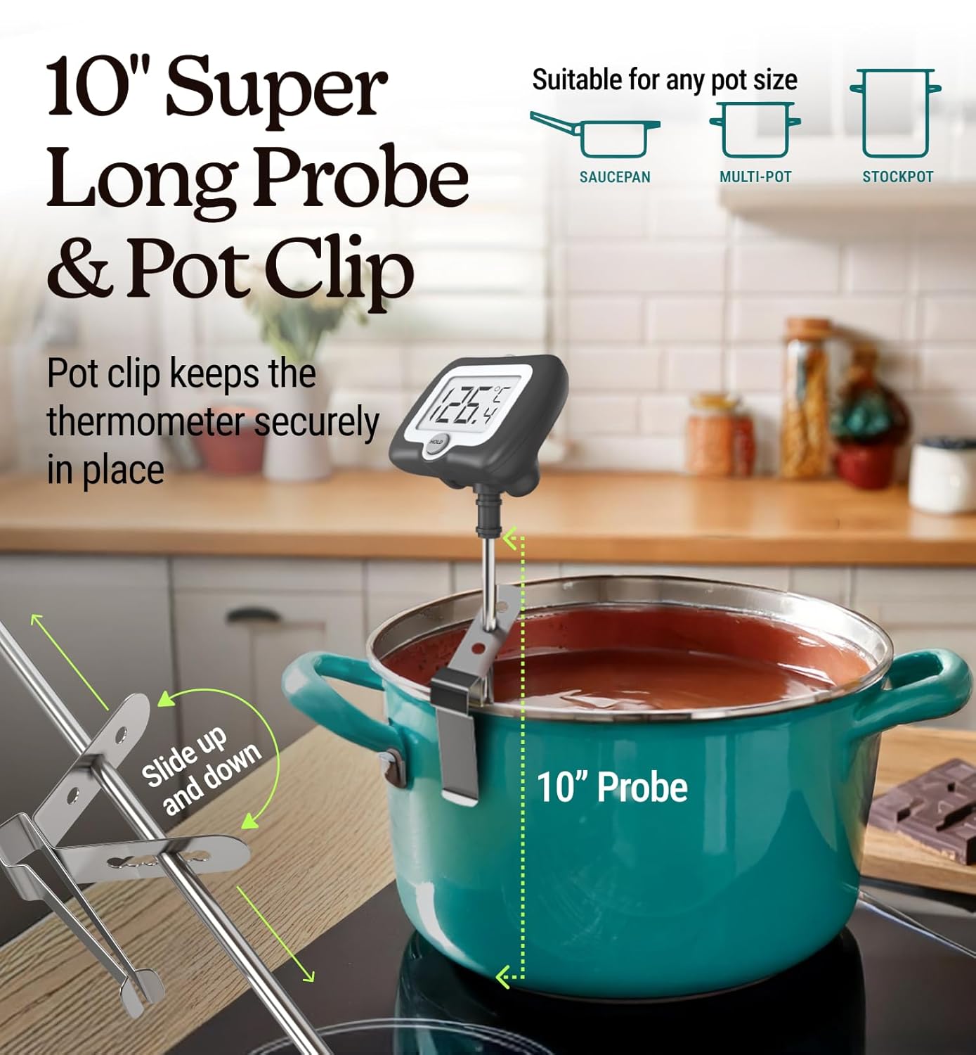 Digital Candy Thermometer with Pot Clip, 10" Long Stainless Steel Probe, Instant Read Kitchen Thermometer for Cooking, Baking, and Candy Making (Black)