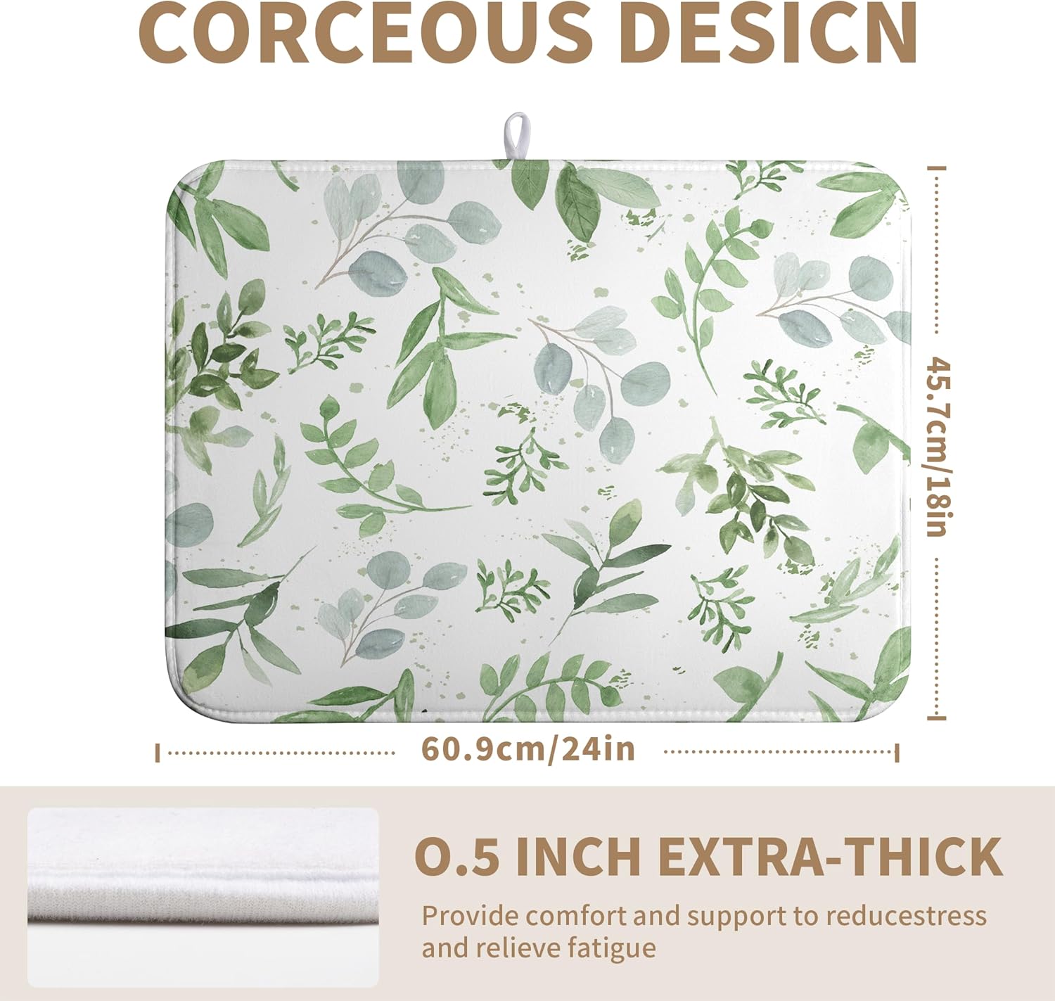 - [Multi-functional]: This Spring Sage Green Leaves Eucalyptus Leaf dish drying mat can be placed under the dish rack to collect dripping water to keep the counter dry and clean, or you can place bottles, pots, plates, bowls, cups and other utensils directly on the mat. Spring Sage Green Leaves Eucalyptus Leaf dish drying mat can also be placed under the coffee machine to absorb spilled coffee.