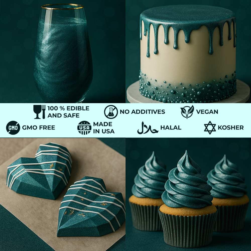 - 𝗙𝗢𝗢𝗗 𝗚𝗥𝗔𝗗𝗘𝗗, 𝗩𝗘𝗚𝗔𝗡 𝗙𝗥𝗜𝗘𝗡𝗗𝗟𝗬 & 𝗠𝗔𝗗𝗘 𝗜𝗡 𝗧𝗛𝗘 𝗨𝗦𝗔 Crafted with 100% safe food grade ingredients our luster dust is tasteless, vegan, gluten and dairy free, halal and is made locally in the US. Our edible dark green dust is safe for kids and everyone it also works great as cake drip, cake decor for dark green cake decorations for professional results without affecting its taste