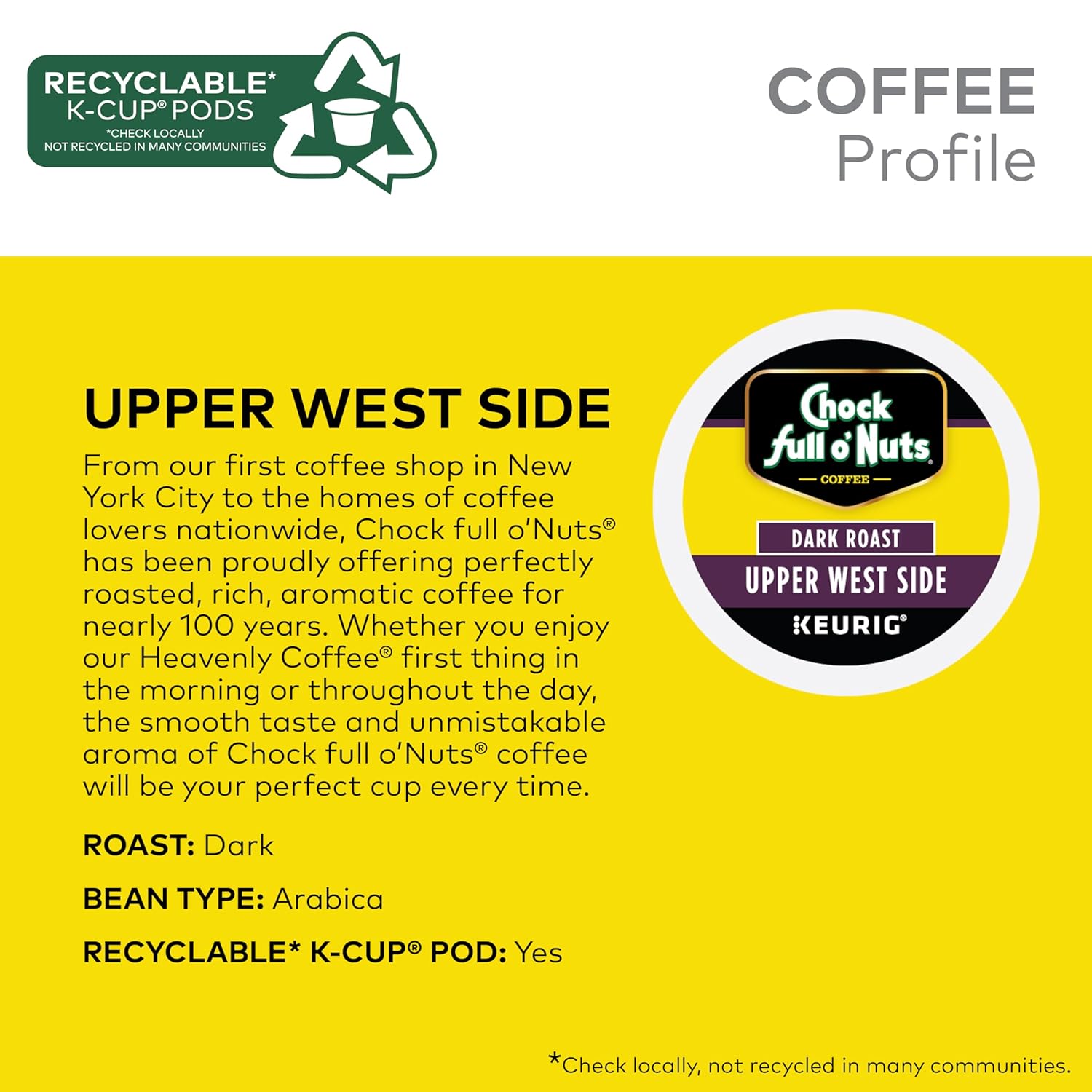Chock Full o'Nuts Upper West Side Coffee, Dark Roast, Compatible with K-Cup Pods, 12 CT (Pack of 6)
