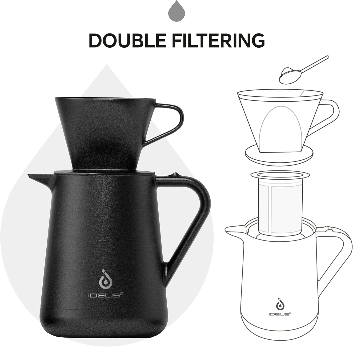 Ideus Insulated Pour Over Coffee Maker Set 20oz, Stainless Steel Coffee Pot Pour Over Set Camp Coffee Carafe BPA-Free with Dripper and Tea Infuser for Home, Office & Camping (Black)