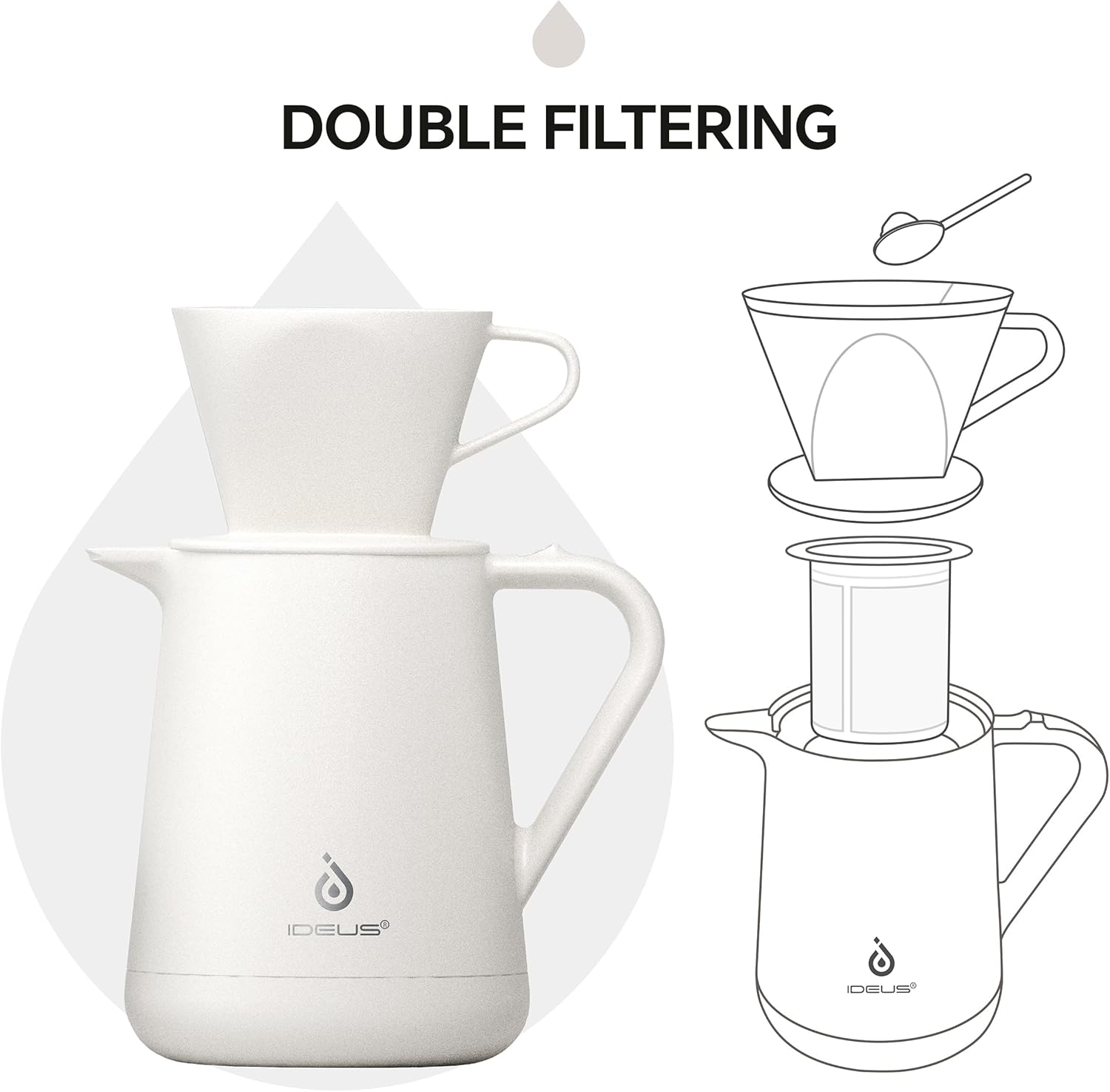 Ideus Insulated Pour Over Coffee Maker 20oz, Stainless Steel Coffee Pot Pour Over Set Camping Coffee Carafe BPA-Free with Dripper for Home, Office & Camping (White)